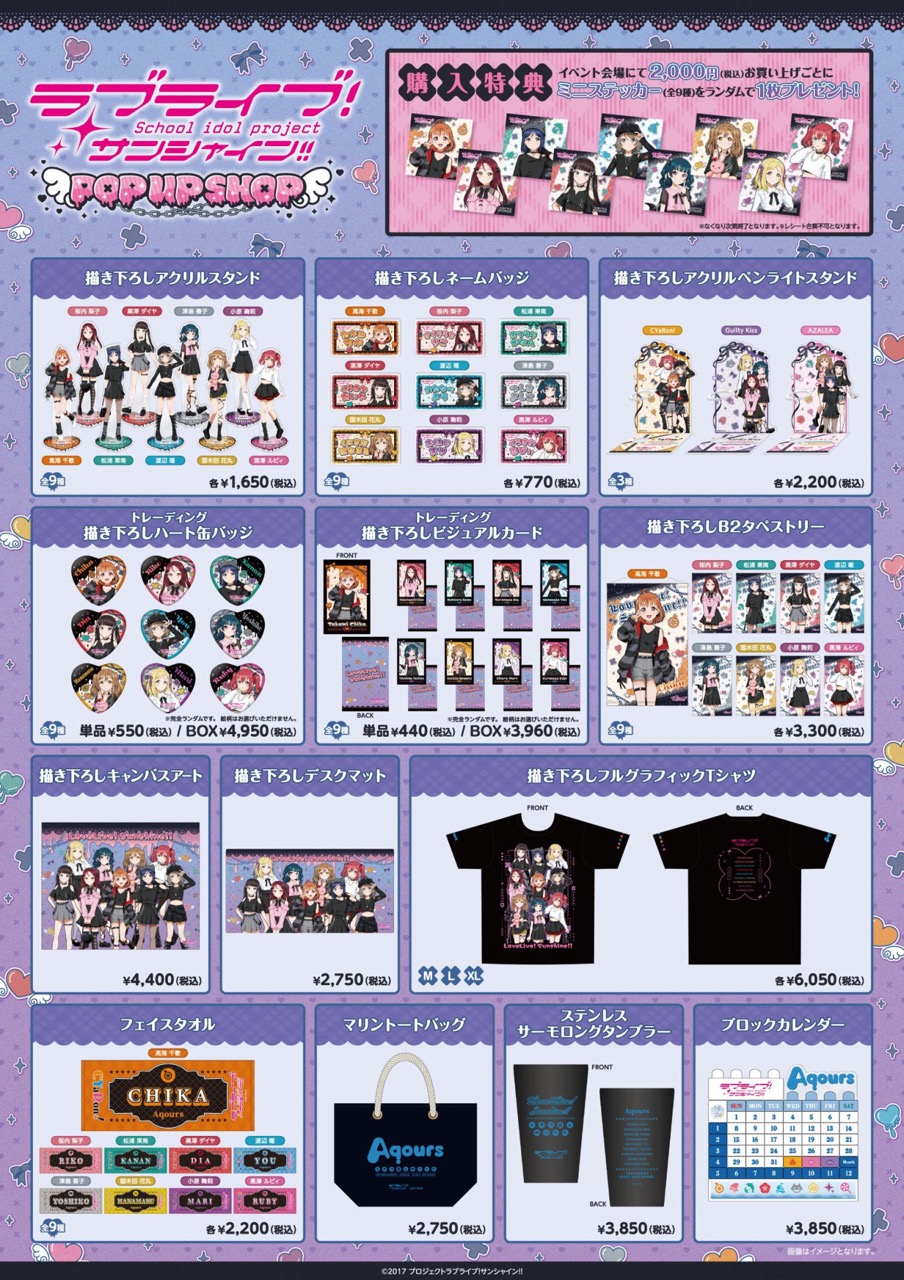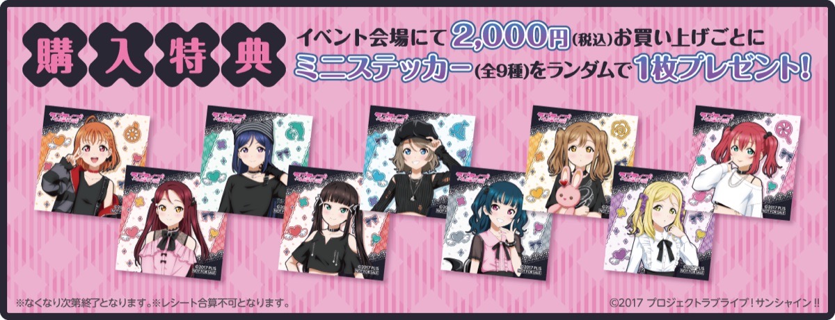アニメ「ラブライブ!サンシャイン!!」ポップアップストアでは、イベント限定のガーリーファッションに身を包んだキャラクターたちのイラストを使用した新作グッズが多数販売される他、グッズをお買い上げ2,000円(税込)ごとに特典として「ミニステッカー 全9種」をランダムに1枚プレゼント!
