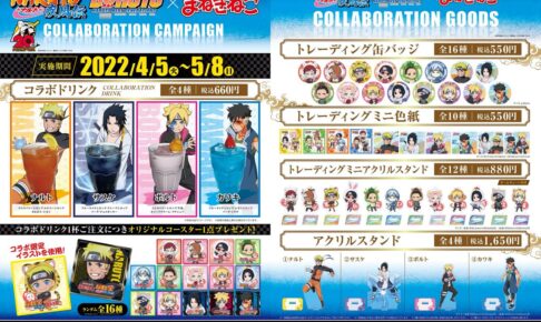 岸本斉史先生による人気漫画を原作としたTVアニメ「NARUTO -ナルト- 疾風伝」と「BORUTO -ボルト- NARUTO NEXT GENERATIONS」× カラオケまねきねこ全国にて、2022年4月5日〜5月8日までの期間限定でコラボが開催される。ナルト・サスケ・ボルト・カワキのドリンクや特典が登場!