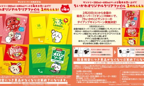 不器用ながらも何事も一生懸命頑張って仲間と強く生きている姿が尊い、イラストレーター「ナガノ」先生による大人気作品「ちいかわ」× サントリーによるコラボキャンペーンが、2024年2月20日より開催!全国のイオン(沖縄除く)にて、対象商品を購入すると「オリジナルA4クリアファイル (全4種)」をプレゼント!