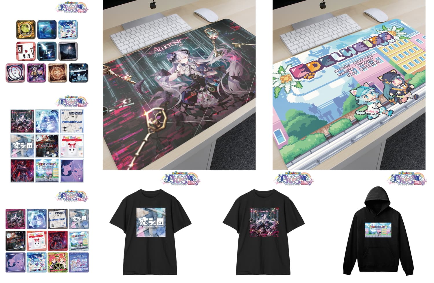 アーケード音楽ゲーム『maimai でらっくす PRiSM PLUS』の新作グッズが、2026年3月中旬に発売予定。楽曲ジャケットイラストを使用したアクリルコースターや缶バッジ、ステッカーに加え、フーディーやTシャツ、デスクマットがラインナップする。2025年12月開催のポップアップストアで先行販売された商品。