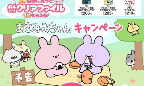 あなたの気持ちを浅くする寄り添いうさぎ「あさみみちゃん」× 全国のファミリーマートにて、2024年4月2日より「A4クリアファイル」が貰えるコラボキャンペーンが実施される。「あさみみちゃん × ファミマ」では、対象のお菓子を一度に2個購入の方にあさみみちゃん「A4クリアファイル (全6種)」を1枚をプレゼント。