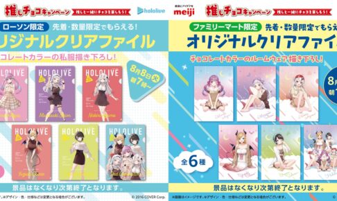 大人気Vtuberグループ「ホロライブ」× 全国のローソン & ファミリーマートにて2023年8月8日より明治とのコラボキャンペーンが実施される。対象商品を購入の方に紫咲シオン・湊あくあ・百鬼あやめ・癒月ちょこ・大空スバルらがデザインされた「ホロライブ クリアファイル」からお好きな絵柄を1枚プレゼント!