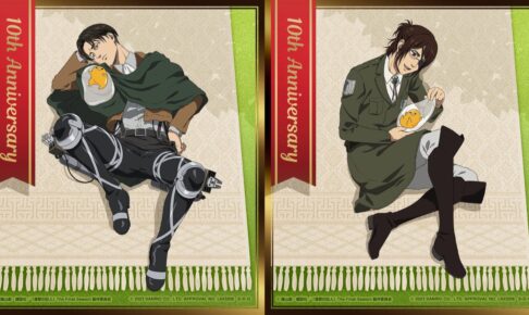 諫山創先生による大人気漫画を原作としたアニメ「進撃の巨人」× サンリオキャラクターズ「ぐでたま」との互いの10周年を記念して、エレン・アルミン・ミカサ・ハンジさん・リヴァイらの描き下ろしイラストが全て解禁された。さらにジャン・コニー・ライナー・アニ・ピークも加えた描き起こしミニキャライラストもラインナップ!
