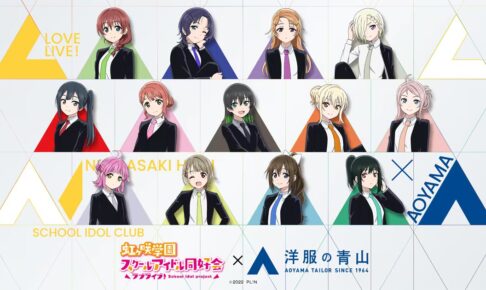 大人気スクールアイドルプロジェクトのシリーズ第3作「ラブライブ! 虹ヶ咲学園スクールアイドル同好会 (ニジガク)」× 洋服の青山 60周年を記念して、2023年11月1日よりコラボが開催される。ブラックスーツに身を包んだアイドル達の描き下ろしイラストを使用したコラボ限定グッズや、コラボブラックスーツが登場!