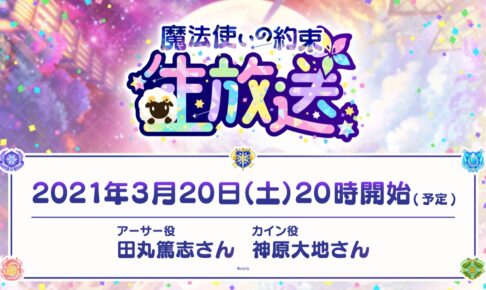 coly ×「都志見文太」さんが贈るリリースから1周年を迎えた人気スマホゲーム「魔法使いの約束 (まほやく)」より関連情報を不定期でお届けする公式番組「魔法使いの約束生放送」が「にこにこ生放送」にて配信決定!記念すべき第1回は2021年3月20日20時より配信開始!田丸篤志さん、神原大地さんが出演!