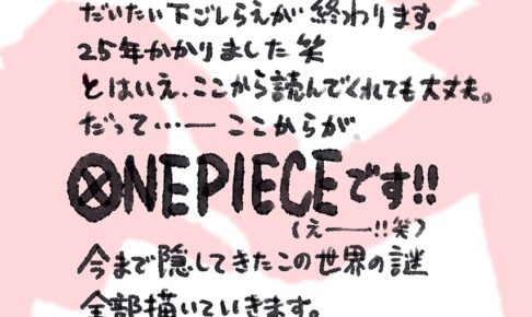尾田栄一郎先生による国民的大人気漫画「ONE PIECE (ワンピース)」の連載が2022年7月25日発売の週刊少年ジャンプ34号より再開。これに先駆け、7月19日発売の33号に掲載される尾田先生の直筆コメントが、ONE PIECE公式サイトにて先行公開された。