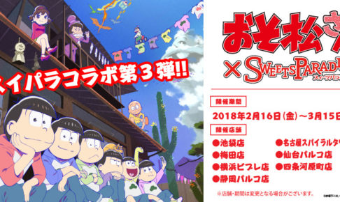 大人気TVアニメ「おそ松さん」x スイーツパラダイス全国7店舗にて2/16よりスイパラコラボカフェ第3弾が開催!コラボレーション開催店はスイパラ池袋店、横浜ビブレ店、仙台パルコ店、静岡パルコ店、名古屋スパイラルタワーズ店、四条河原町店、梅田店の全7店舗にて!開催期間は2018年2月16日〜3月15日まで!