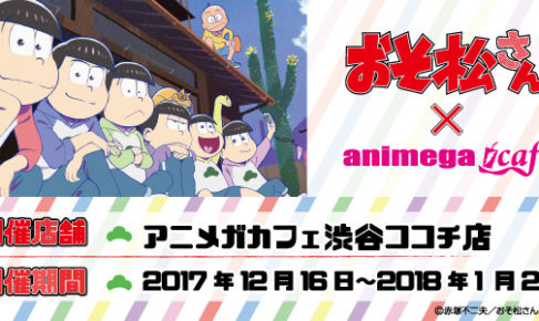 TVアニメ「おそ松さん」x アニメガカフェ(渋谷・仙台・町田)にて期間限定のコラボカフェ開催中!おそ松さんのキャラクターをイメージしたメニューがラインナップ!開催期間はアニメガカフェ 渋谷ココチ店・仙台ロフト店は2018年1月21日まで、アニメガカフェ 町田店は2018年1月24日までとなっている。