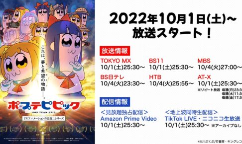 さまざまなクソネタを豪華声優陣が演じる注目の新作、「大川ぶくぶ」先生による人気クソ4コマ漫画を原作としたTVアニメ「ポプテピピック (ポプテピ)」第2シーズンが2022年10月1日より放送決定!また、同日の10月1日 25時30分よりアマゾンプライム・ビデオ)にて独占見放題配信も開始!