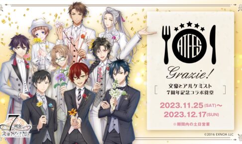 DMM GAMESより配信されているブラウザゲーム「文豪とアルケミスト」の7周年を記念し、Cassolo (カッソーロ) 東京にて2023年11月25日〜12月17日までコラボ食堂が開催される。文豪たちをイメージしたコラボメニューの他、7周年を祝うスペシャルメニューや描き下ろしグッズなどが登場!