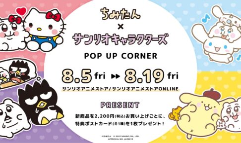 SNSで人気を博す「あにゃ」さんによるキャラクター「ちみたん」× サンリオキャラクターズのポップアップコーナーが、2022年8月5日〜8月19日まで開催される。「ちみたん × ハローキティ」「ちみたん × シナモロール」「ちみたん × バッドばつ丸」「ちみたん × ポムポムプリン」のコラボイラストが解禁!