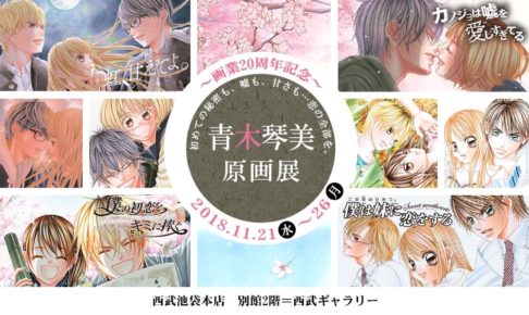 カノ嘘・僕キミ・虹甘・僕妹などで知られる人気漫画家「青木琴美先生」の画業20周年を記念した「青木琴美原画展」が西武池袋本店 別館2階(西武ギャラリー)にて11月21日から11月26日までの6日間限定で開催!貴重な原画、設定資料などが展示される他、青木琴美原画展のために作られた限定オリジナルグッズが多数登場!