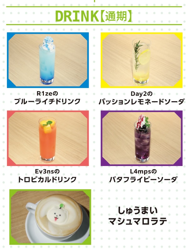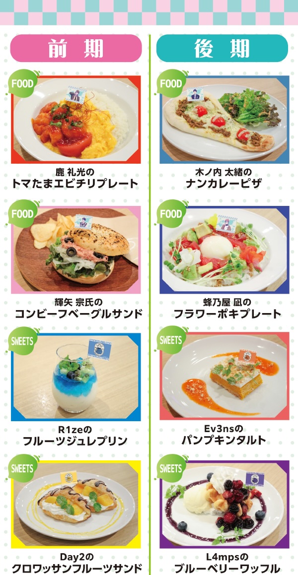 区長4名をイメージしたフード、各班をイメージしたスイーツ & ドリンクなどに加え、会期中に誕生日を迎える斜木七基のバースデースイーツもラインナップ!