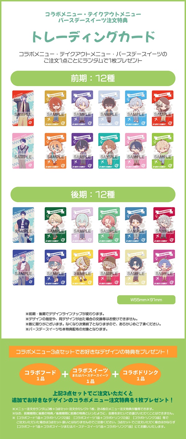 「18TRIP」コラボカフェでは、ニューレトロをテーマとした装いに身を包んだ区長4名をイメージしたフードメニューや、各班をイメージしたスイーツ & ドリンクなどがお楽しみいただける他、メニューを注文の方には特典として「トレーディングカード (前期12種/後期12種)」ランダムに1枚プレゼントされる。
