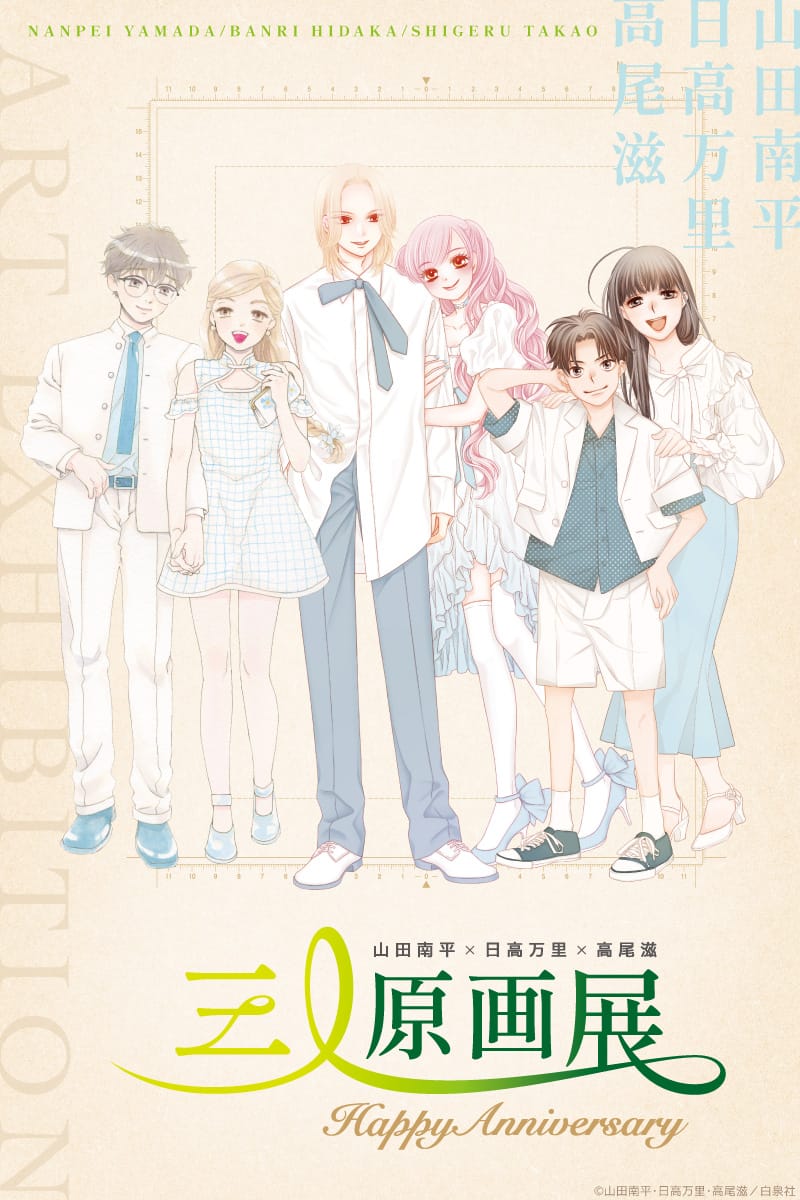 白泉社の代表的な漫画家の一角である「山田南平」先生、「日高万里」先生、「高尾滋」先生の画業周年を記念した原画展「山田南平×日高万里×高尾滋 三人原画展 ~HAPPY Anniversary~」が、東京・豪徳寺の旧尾崎テオドラ邸にて2026年6月6日〜7月7日まで開催される。