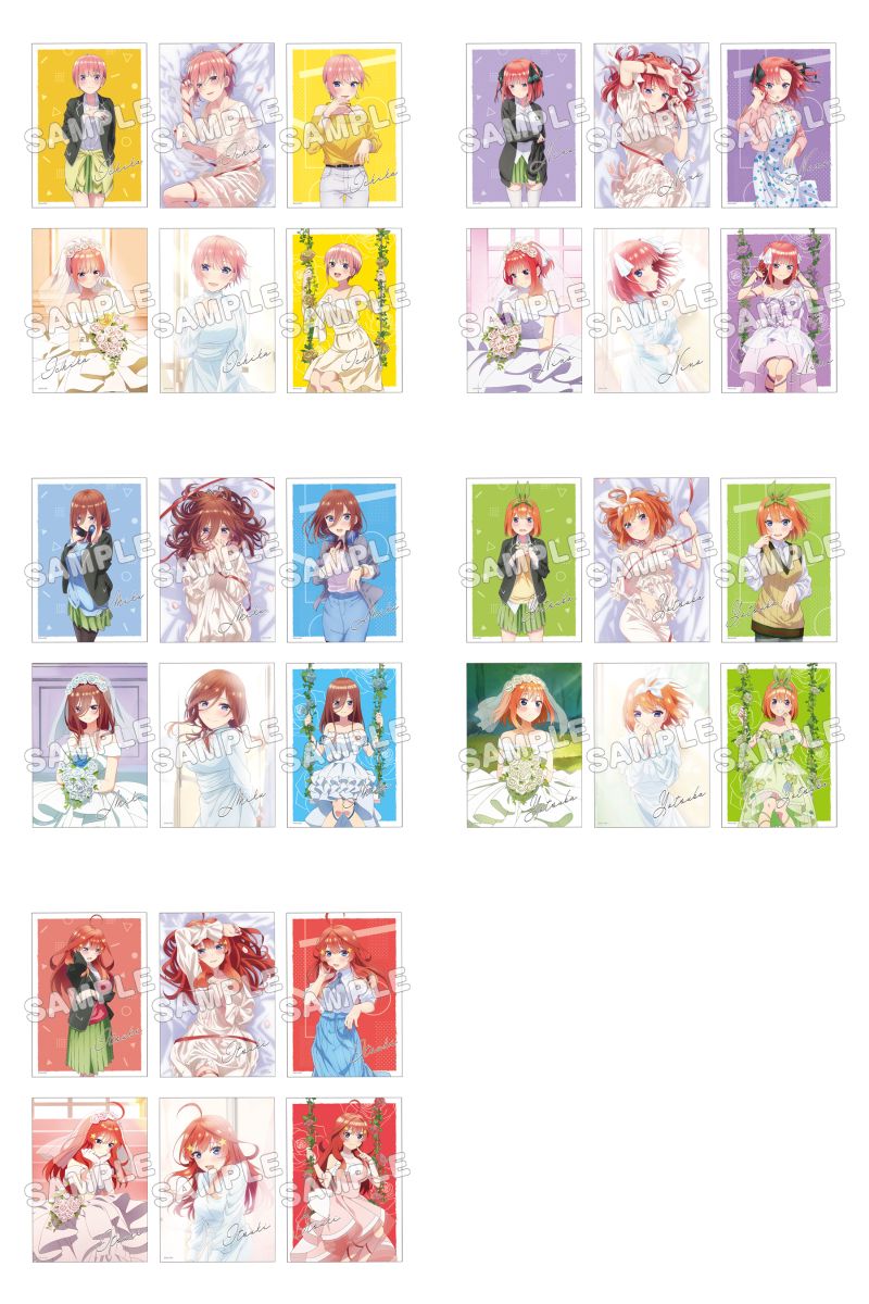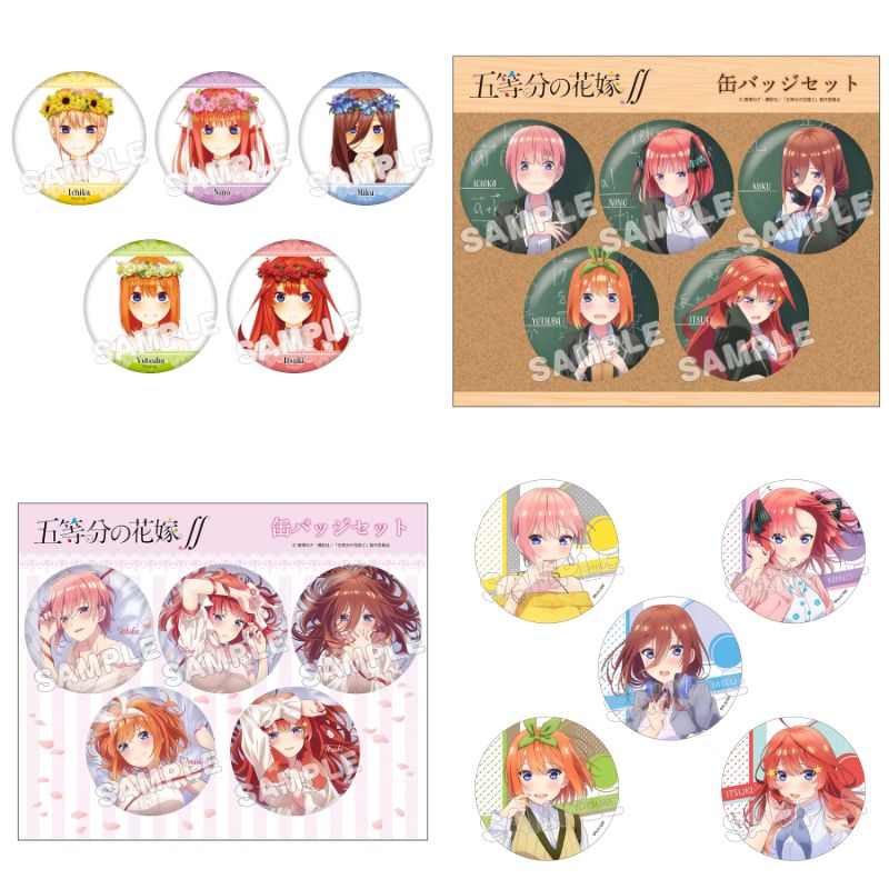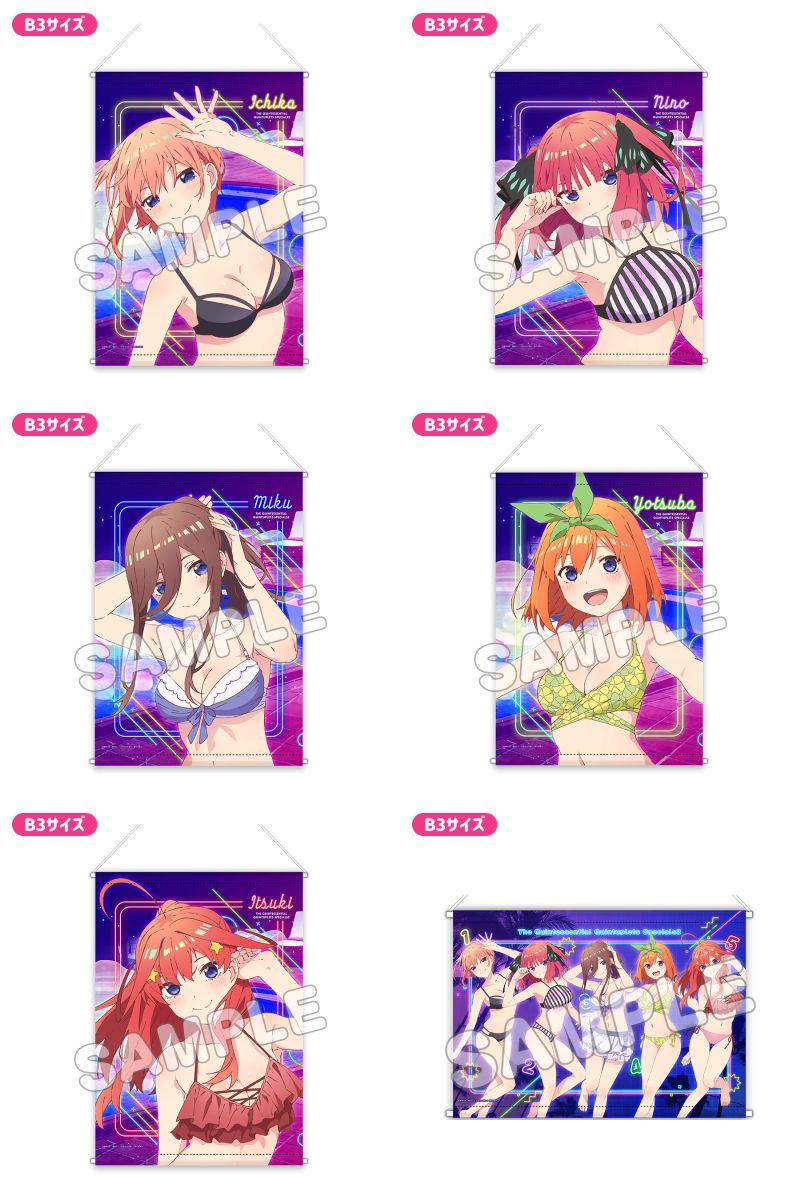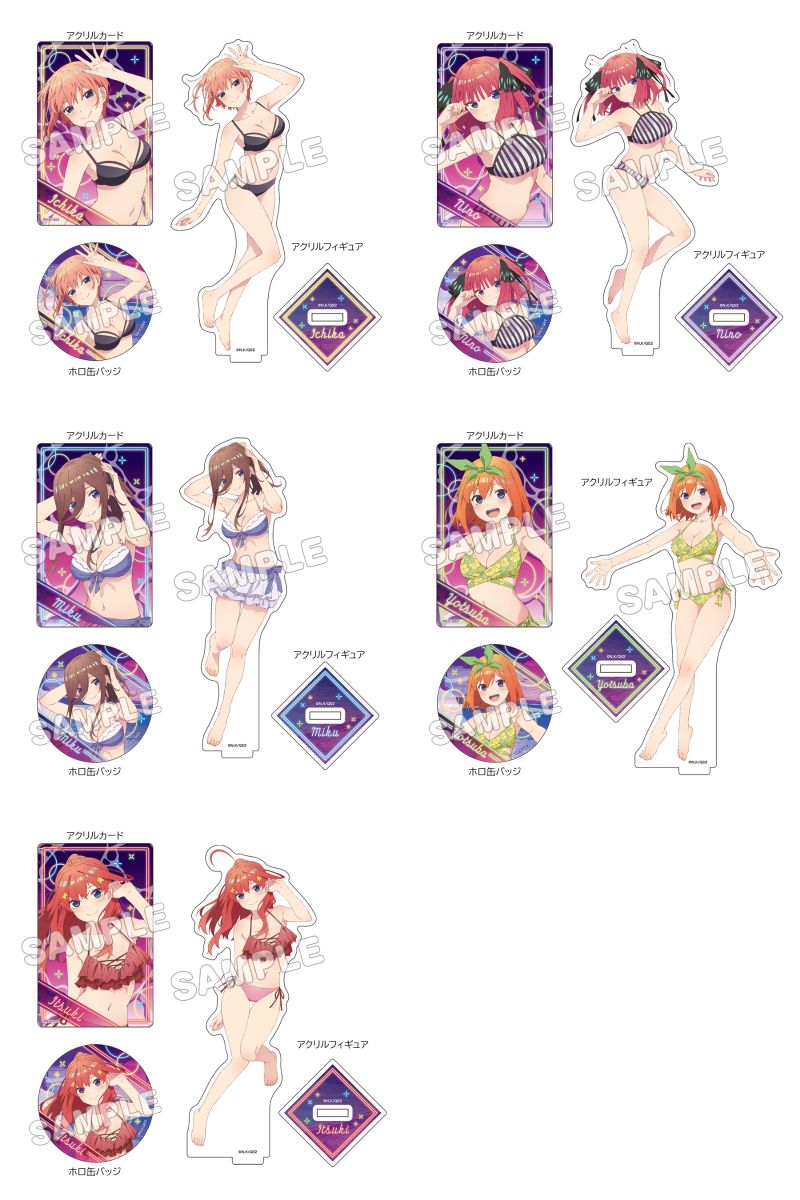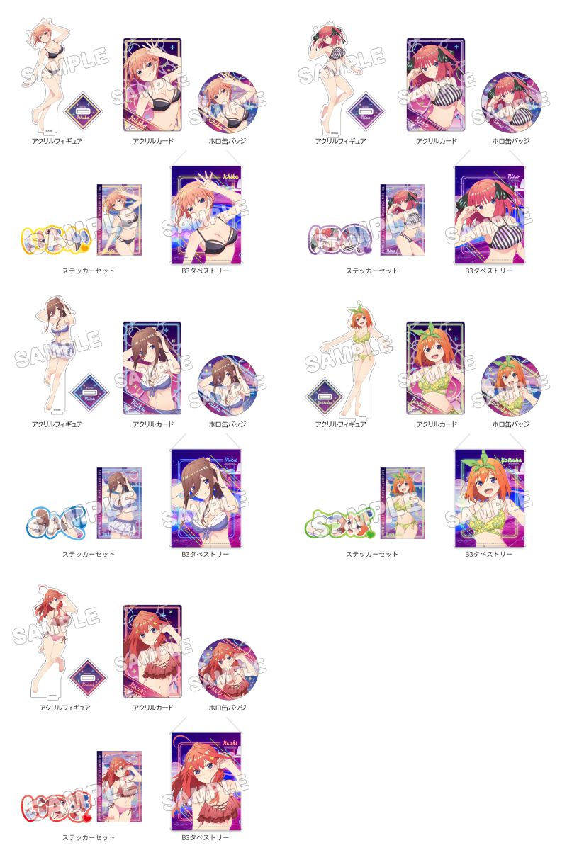 水着ナイトプール、ネグリジェ、ドレス、ED ver.など、一花・二乃・三玖・四葉・五月たちの描き下ろしイラストを使用した「缶バッジ」「アクリルカード」「タペストリー」「グッズセット」など限定グッズが多数ラインナップ。