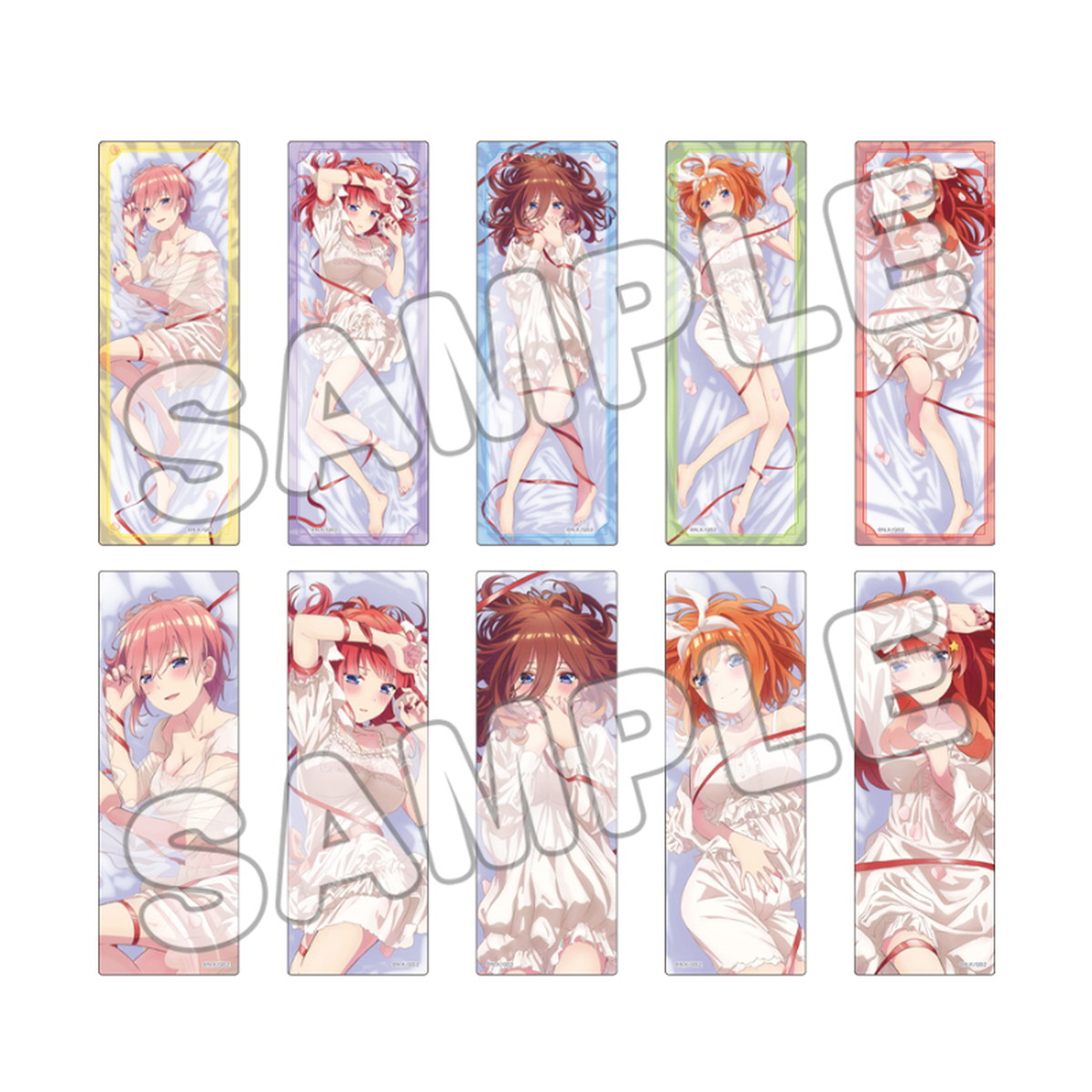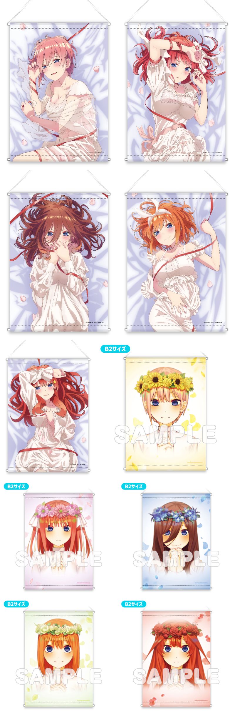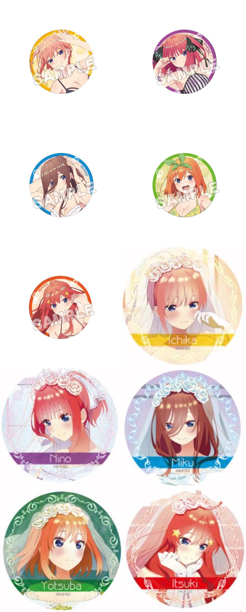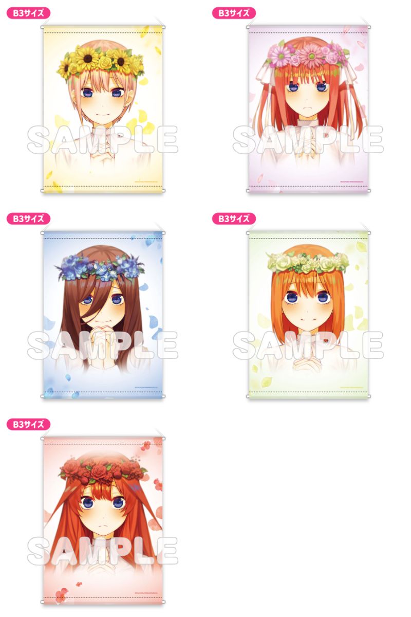 水着ナイトプール、ネグリジェ、ドレス、ED ver.など、一花・二乃・三玖・四葉・五月たちの描き下ろしイラストを使用した「缶バッジ」「アクリルカード」「タペストリー」「グッズセット」など限定グッズが多数ラインナップ。