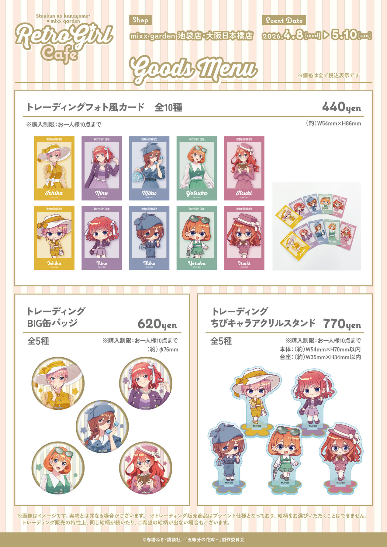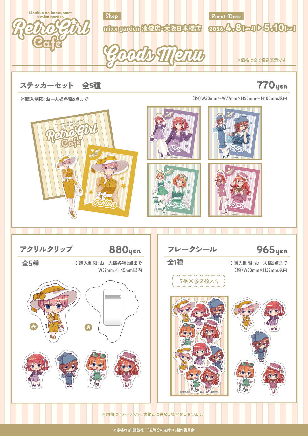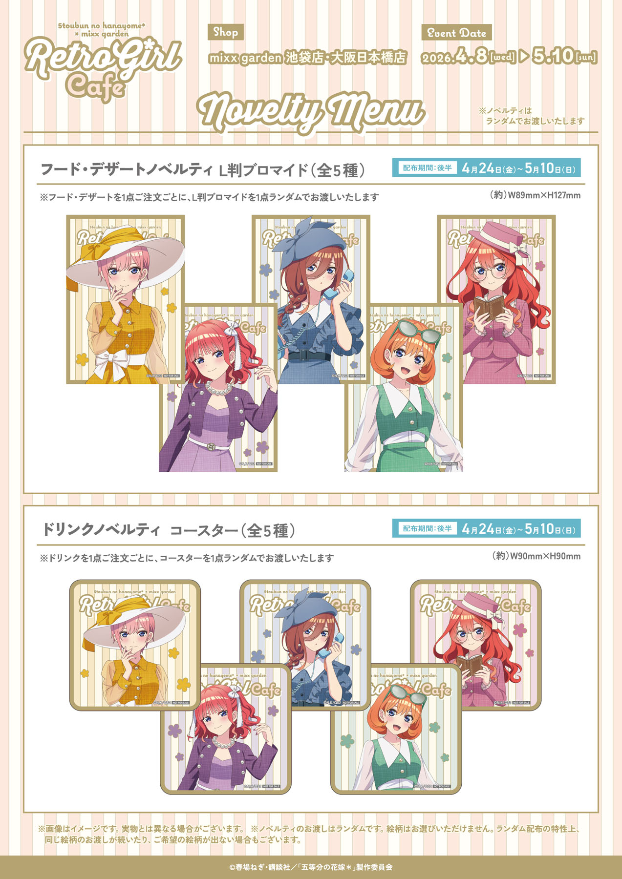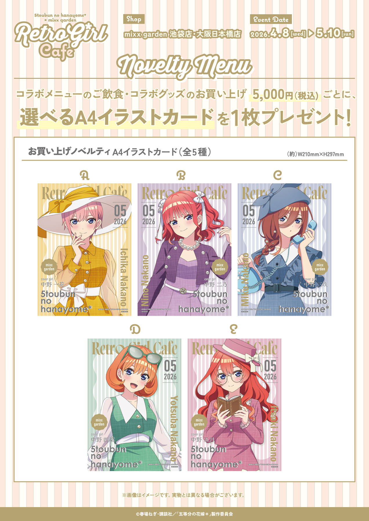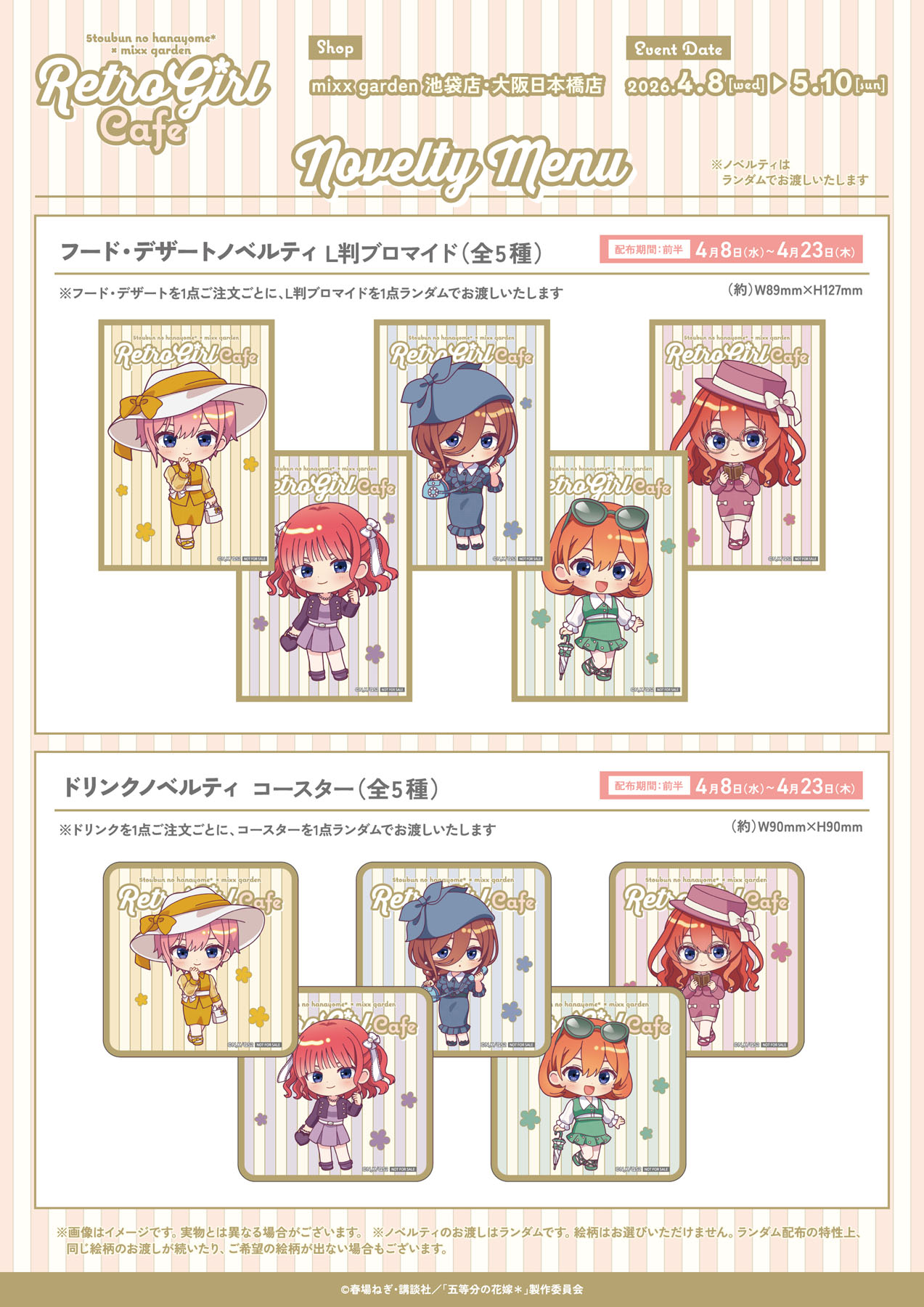 春場ねぎ先生による大人気漫画を原作としたアニメ「五等分の花嫁」× mixx garden (ミックスガーデン) 池袋・大阪にて、2026年4月8日〜5月10日までコラボカフェ『Retro Girl Cafe』が開催される。