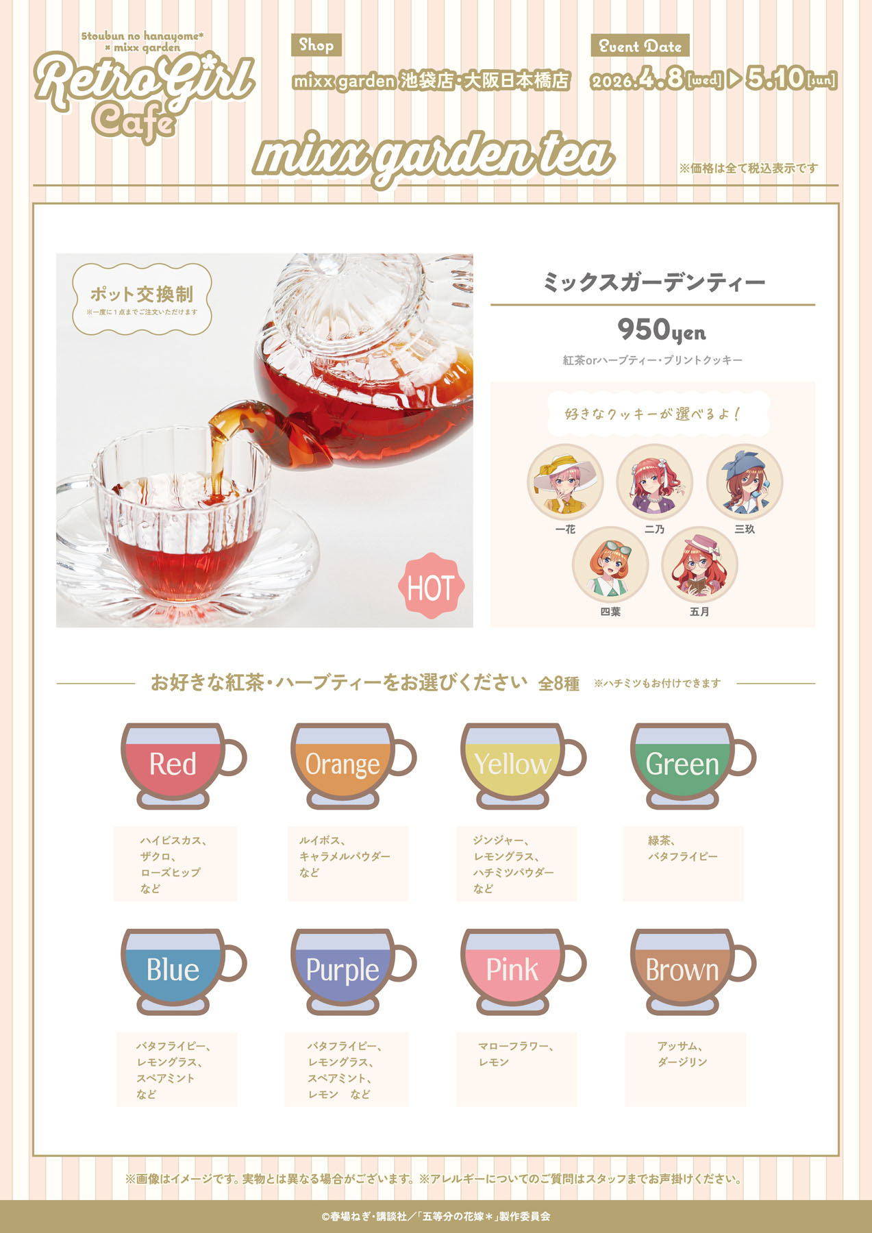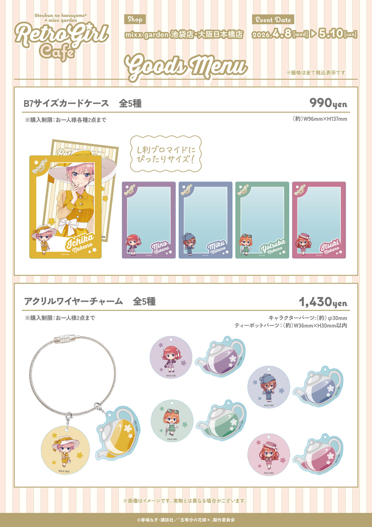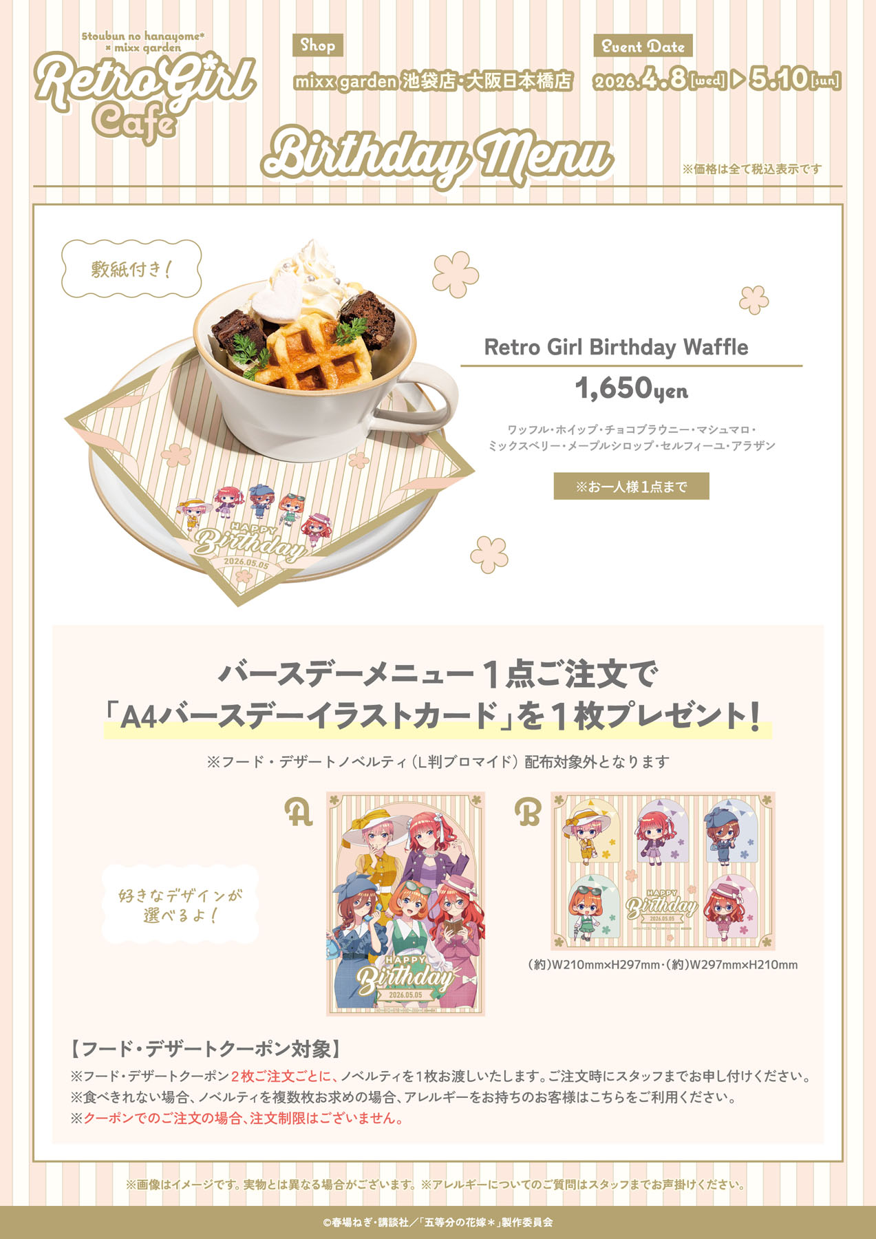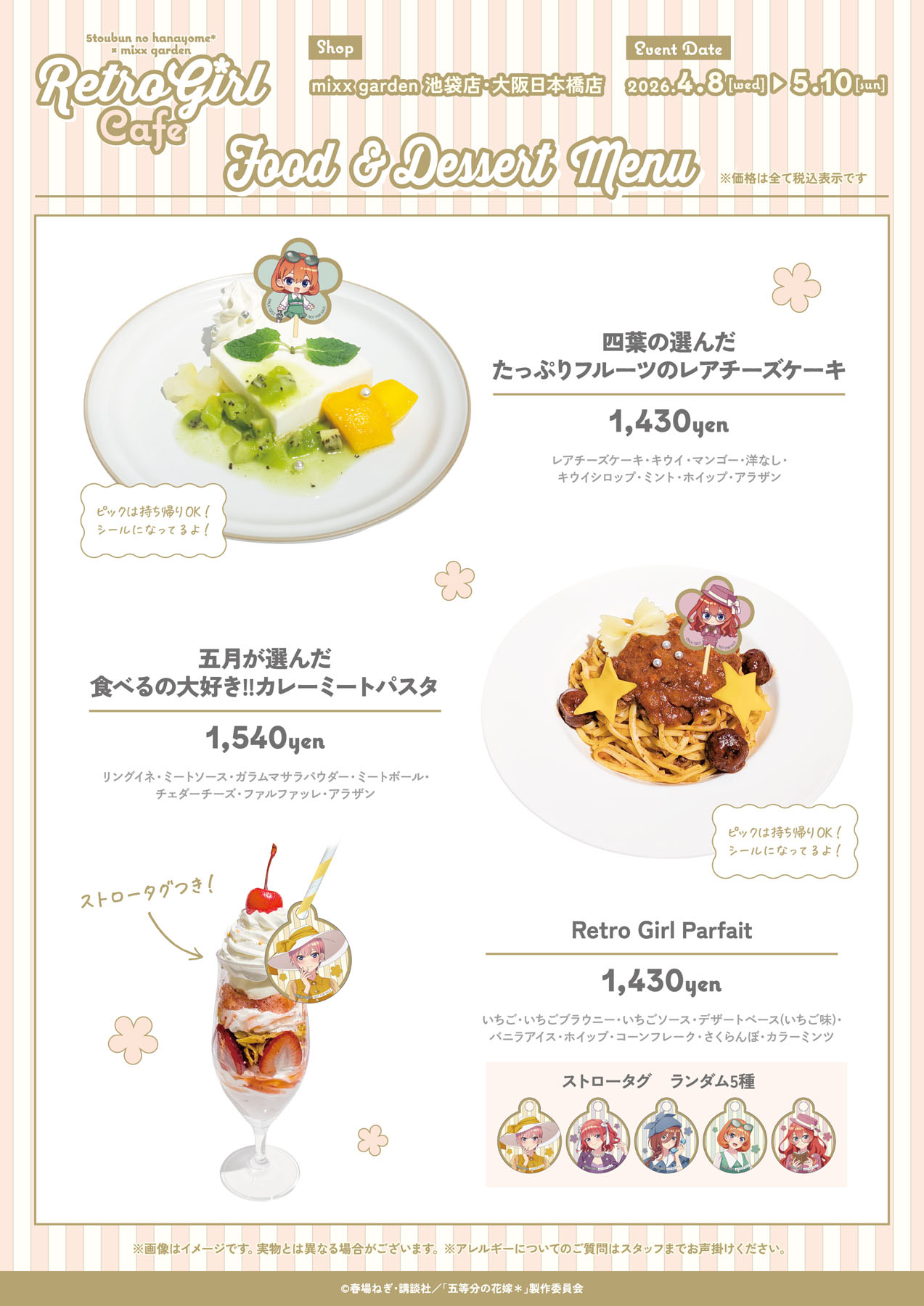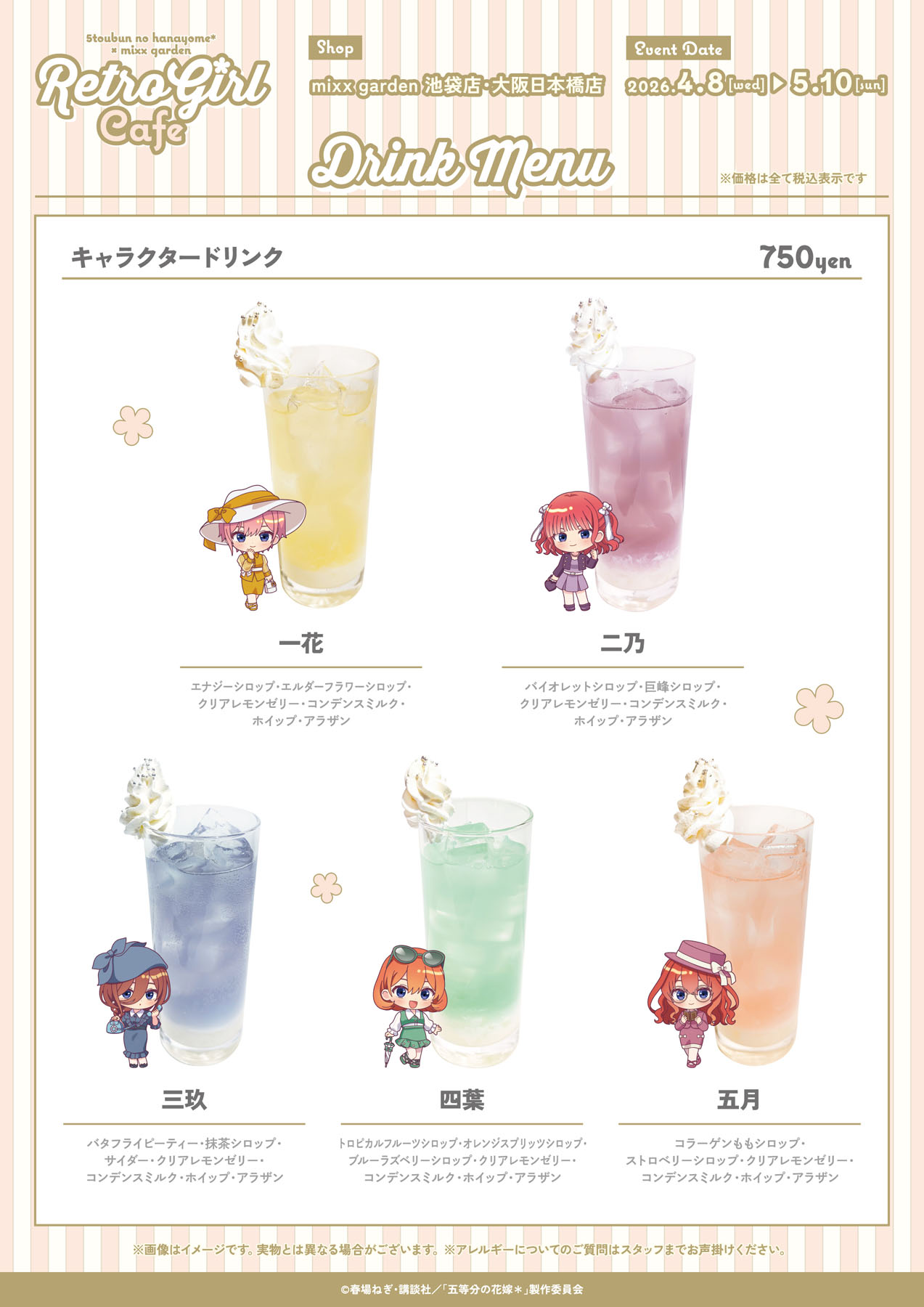 春場ねぎ先生による大人気漫画を原作としたアニメ「五等分の花嫁」× mixx garden (ミックスガーデン) 池袋・大阪にて、2026年4月8日〜5月10日までコラボカフェ『Retro Girl Cafe』が開催される。