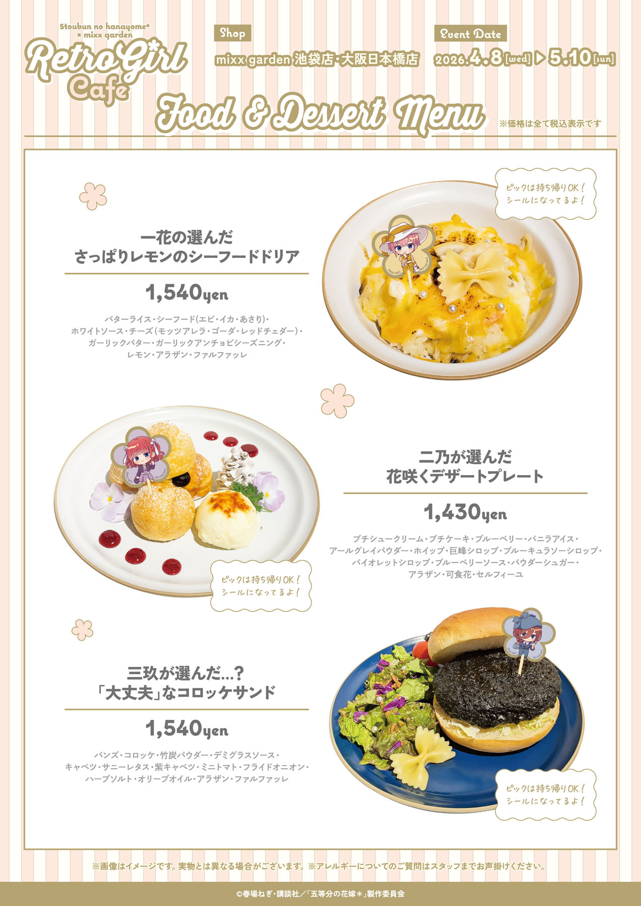 2026年4月8日よりミックスガーデン2店舗にて開催される『Retro Girl Cafe』では、五つ子たちの個性を詰め込んだ彩り豊かなフード、デザート、ドリンクが登場!