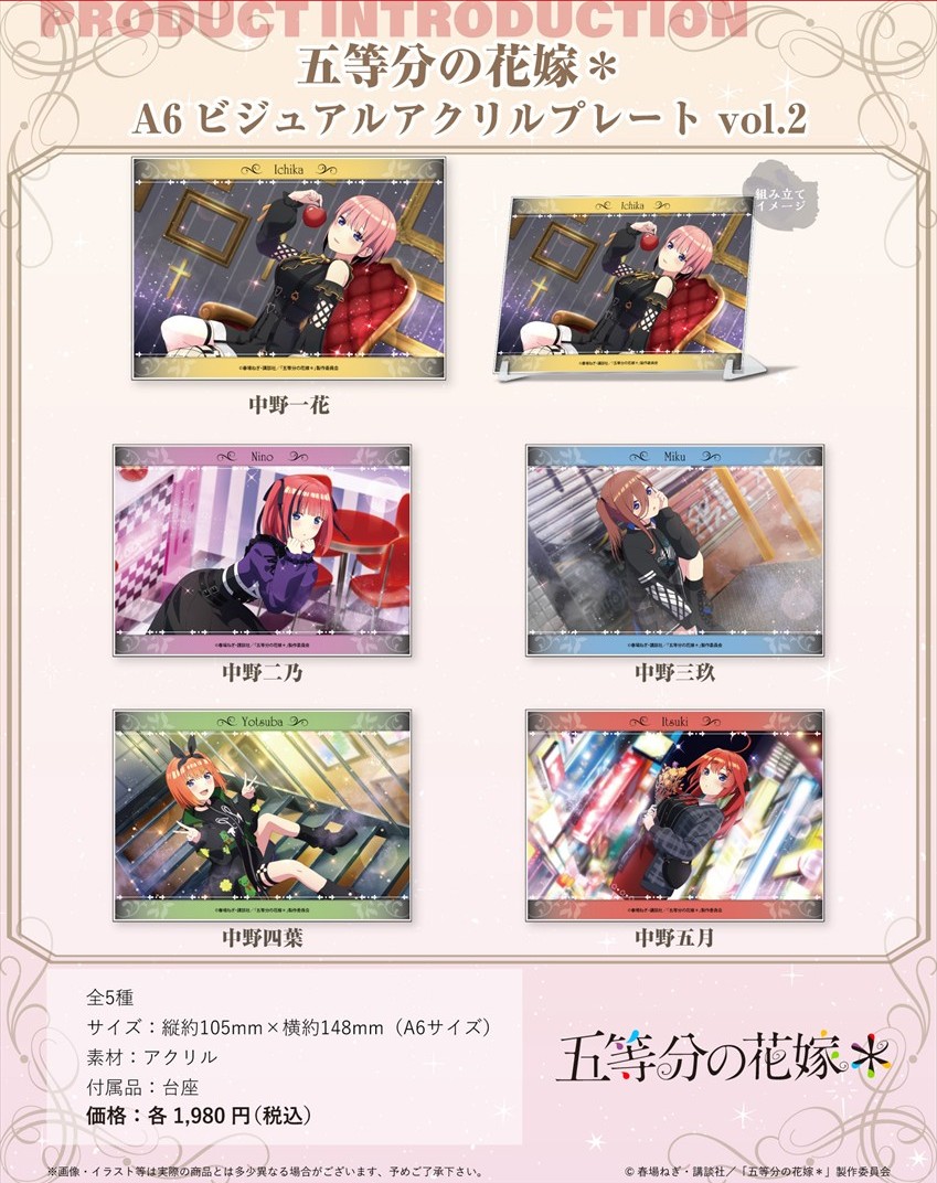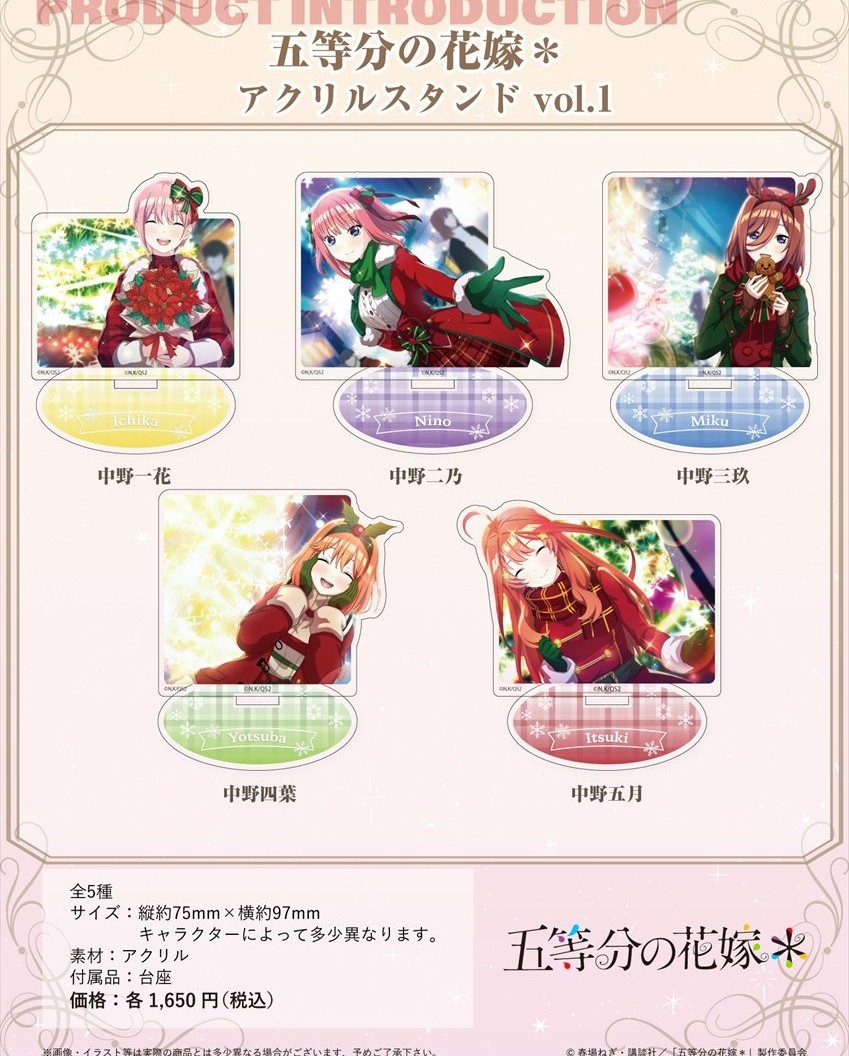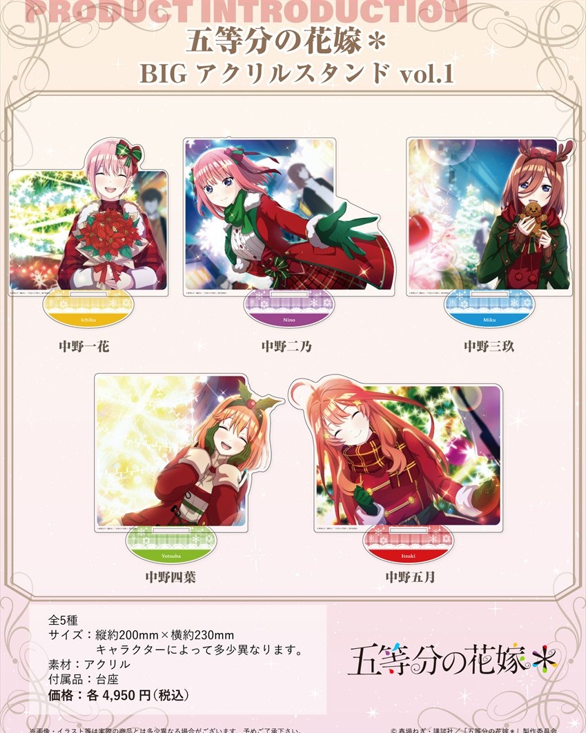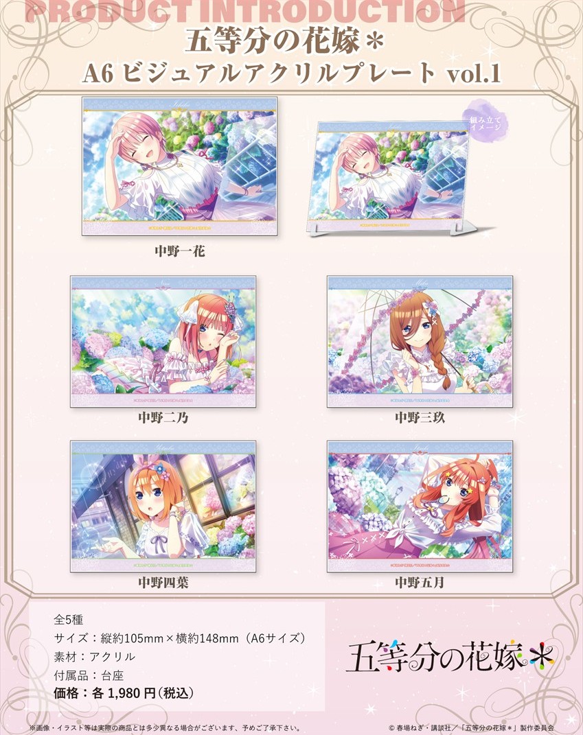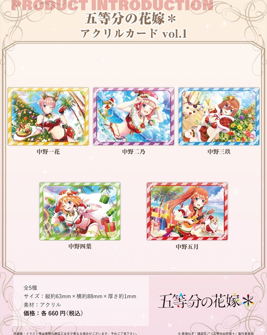 一花・二乃・三玖・四葉・五月たちの「キャンプ」「温泉」「遊園地」「クリスマス」など、様々なシチュエーションが楽しめる美麗イラストを使用した「ブロマイド」「アクリルスタンド」「A6ビジュアルアクリルプレート」など全9種がラインナップ。