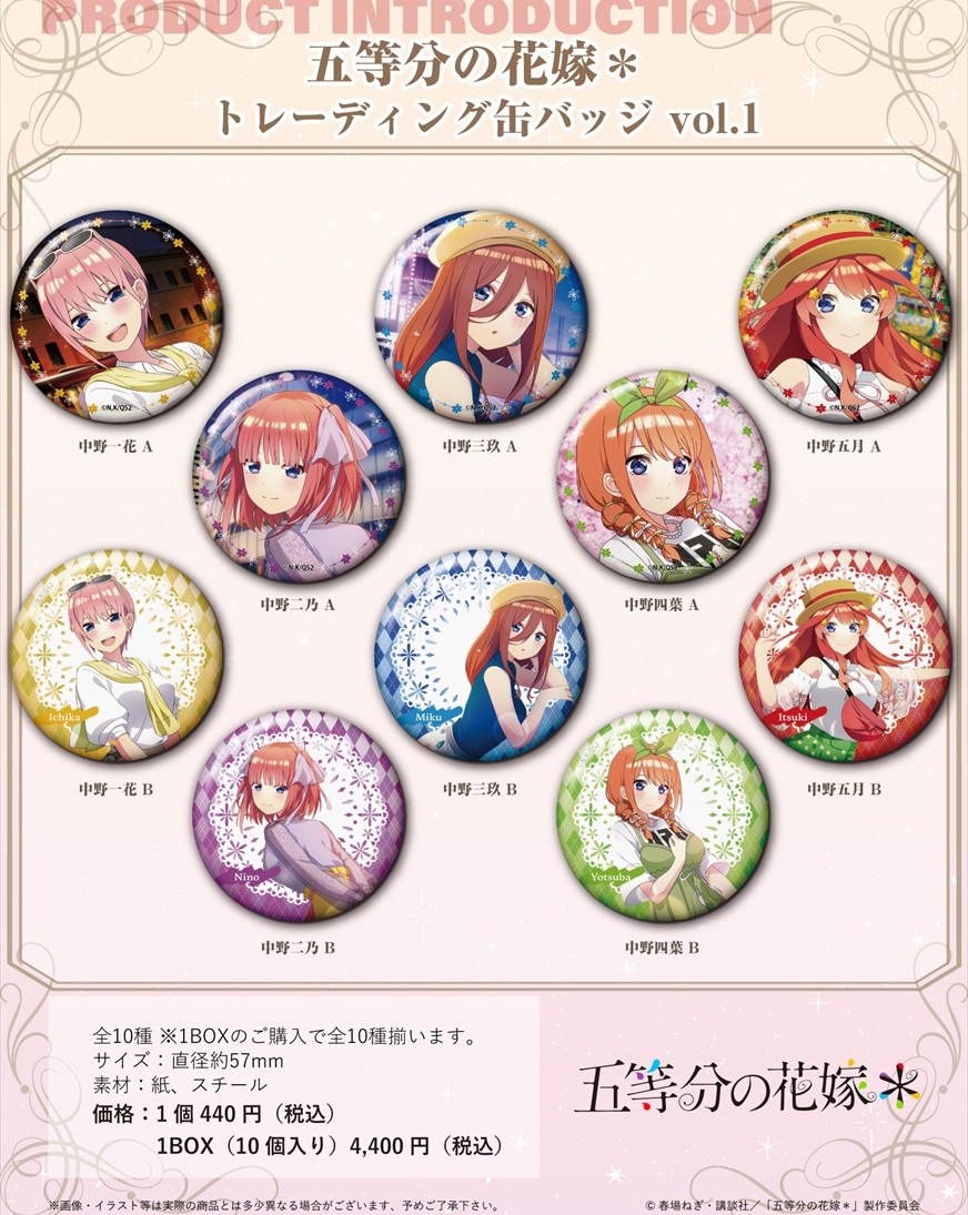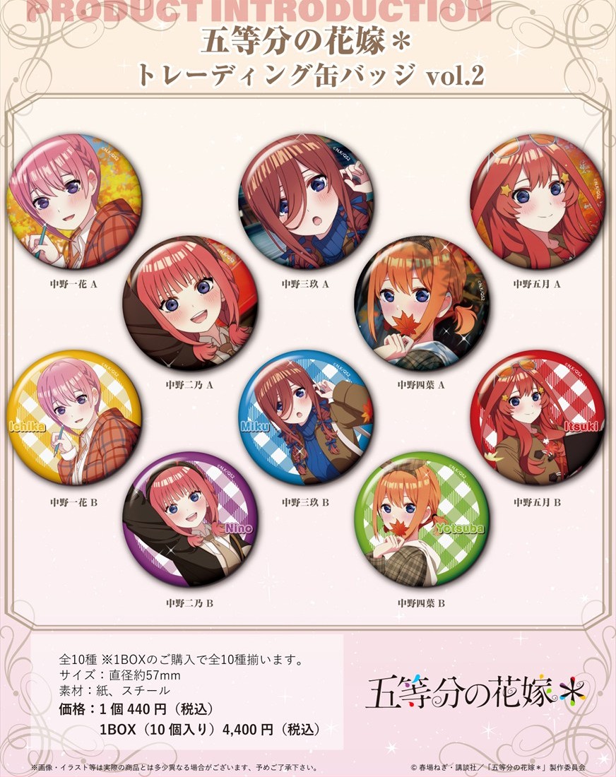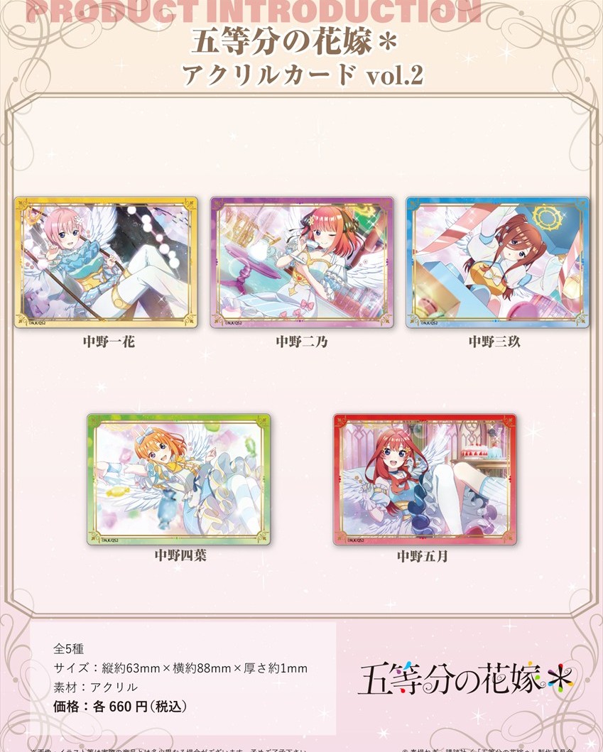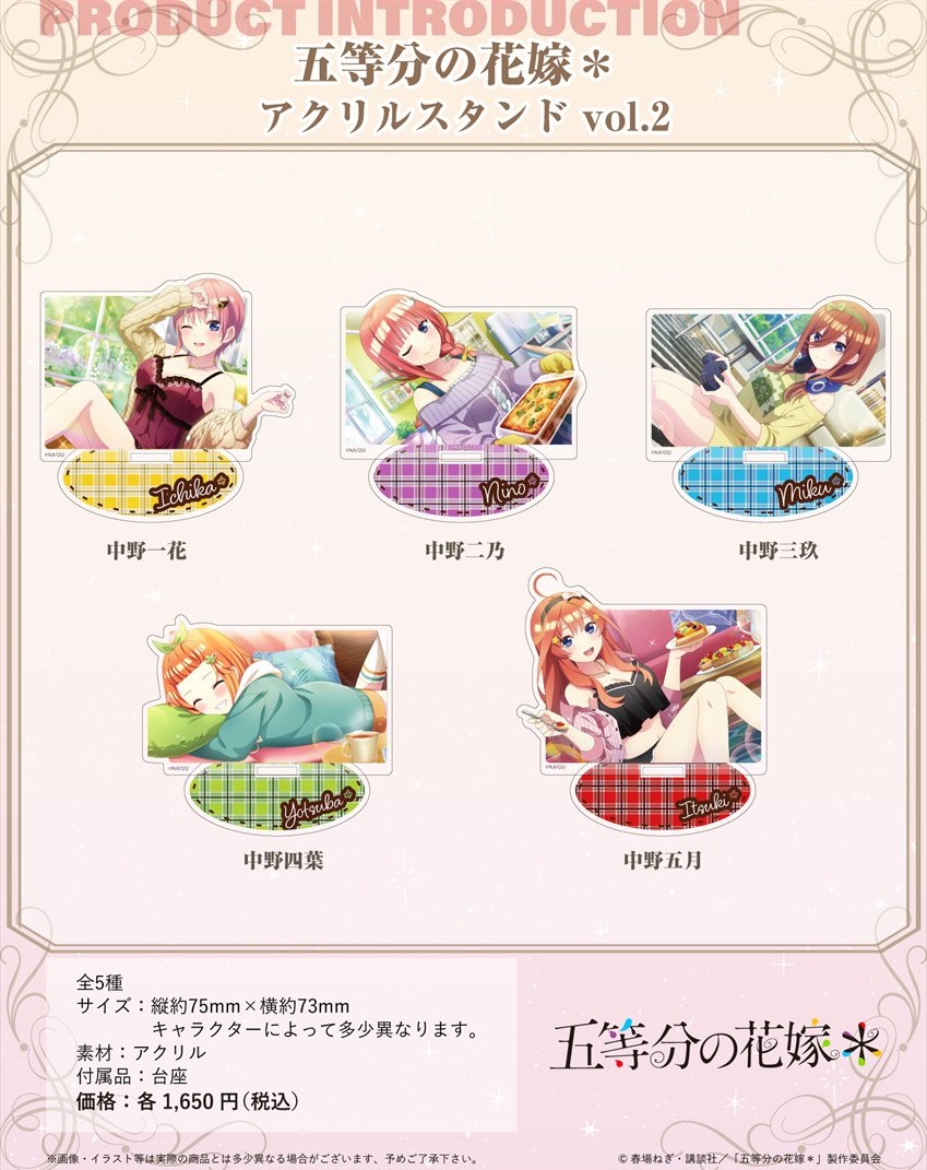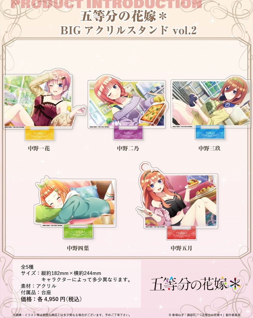 一花・二乃・三玖・四葉・五月たちの「キャンプ」「温泉」「遊園地」「クリスマス」など、様々なシチュエーションが楽しめる美麗イラストを使用した「ブロマイド」「アクリルスタンド」「A6ビジュアルアクリルプレート」など全9種がラインナップ。