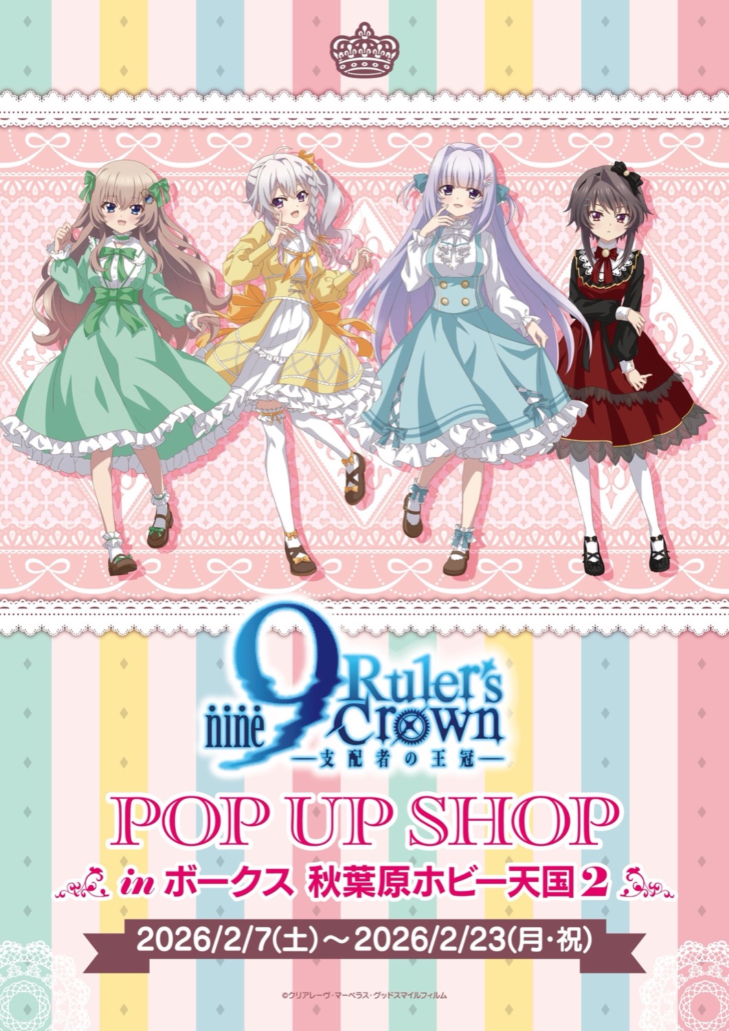 ぱれっとが贈る美少女アドベンチャーゲームシリーズ「9-nine- Ruler’s Crown」のポップアップストアが、ボークス秋葉原ホビー天国2にて2026年2月7日〜2月23日まで開催される。