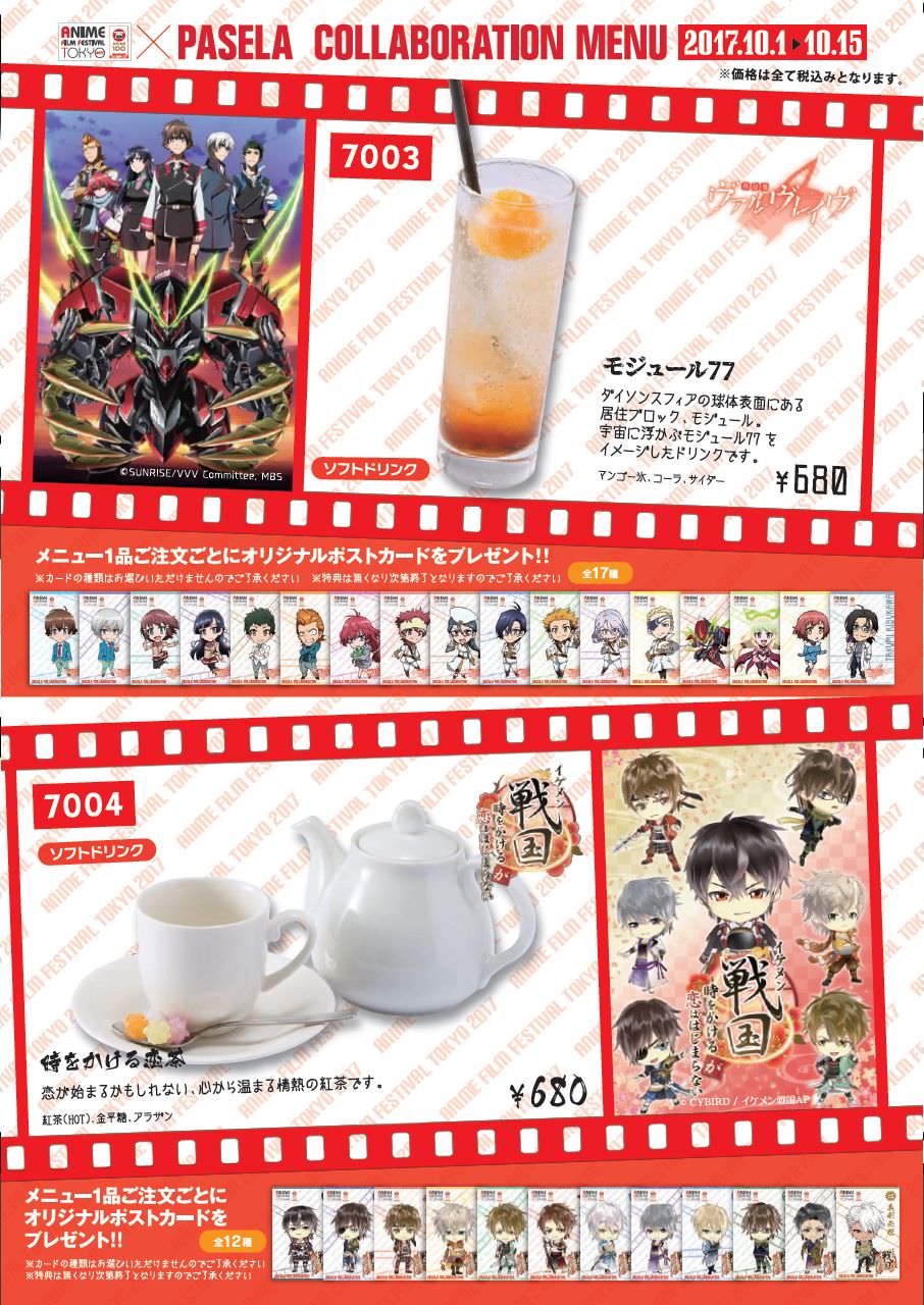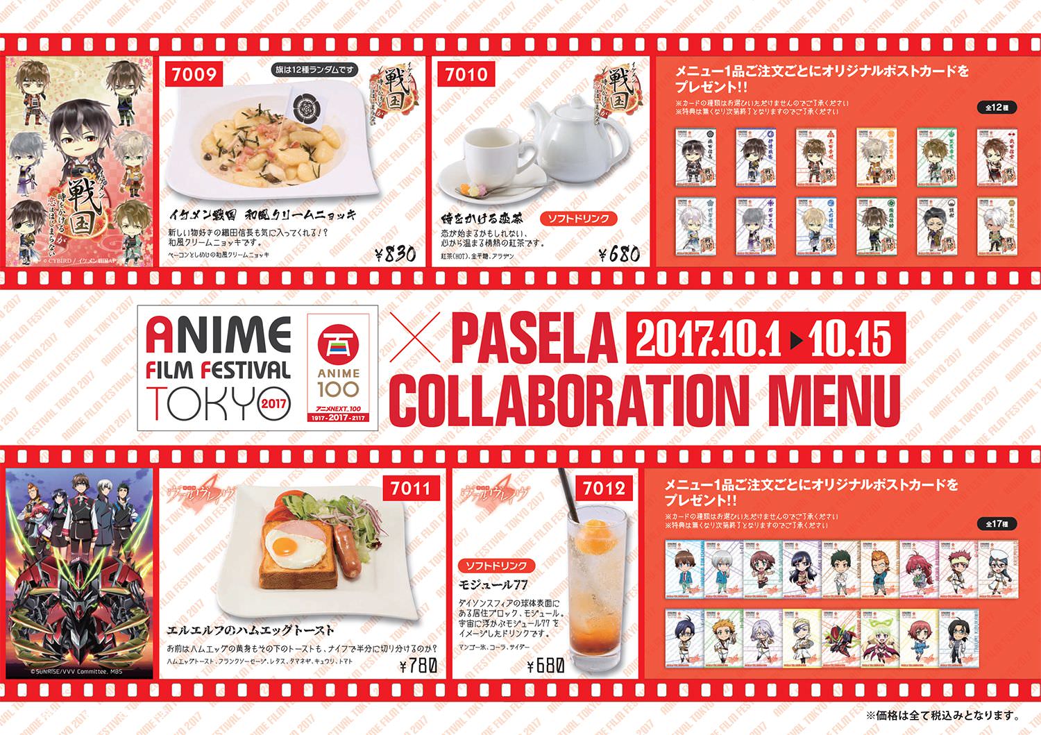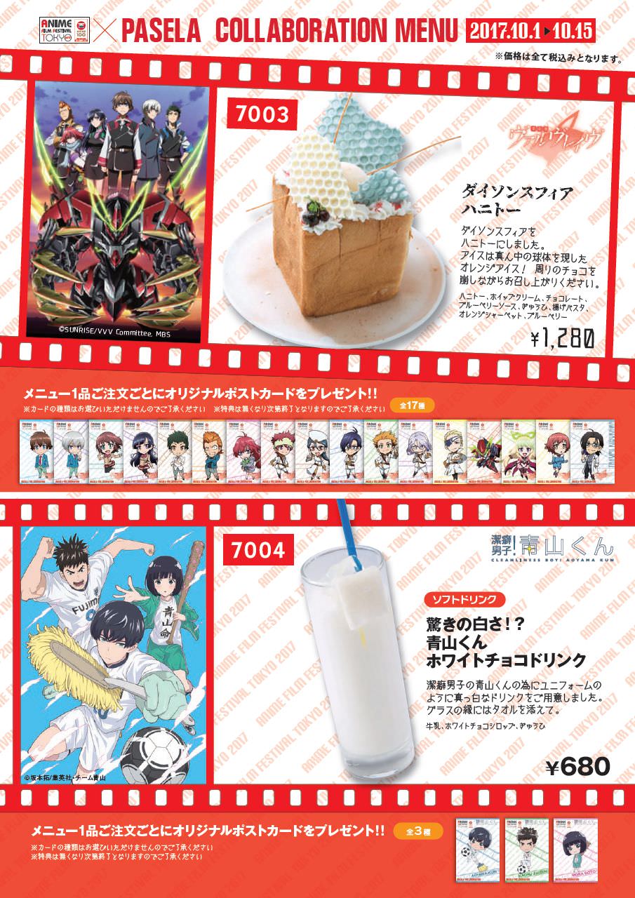 2017年10月新宿エリアで開催する「ANIME FILM FESTIVAL TOKYO 2017 (略称 AFFT2017)」の開催を記念して、AFFT2017 × パセラリゾーツ新宿3店舗とのコラボカフェ開催決定!!コラボ参加作品タイトルは、「おそ松さん」「弱虫ペダル NEW GENERATION」「潔癖男子!青山くん」「革命機ヴァルヴレイヴ」「イケメン戦国◆時をかけるが恋ははじまらない」の5作品とのコラボレーション!!ここでしか食べられないハニートーストなどのコラボメニューや、作品をイメージしたドリンクなどが楽しめる!!開催期間は2017年10月1日〜10月15日までとなっている。