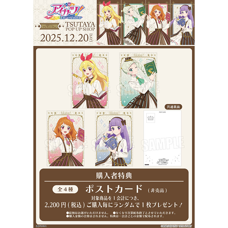 「アイカツ!」ポップアップストアにて、グッズをお買い上げ2,200円毎に特典として「ポストカード 全4種」がランダムに1枚プレゼントされる。
