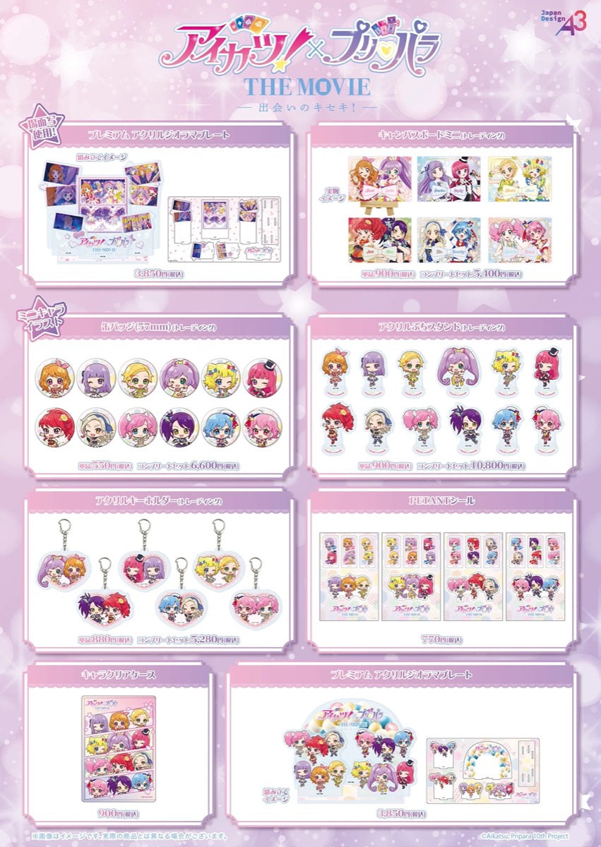 アニメ「アイカツ!×プリパラ」ポップアップストアでは、イベント限定の場面写やミニキャライラストを使用した新作グッズが多数販売される。