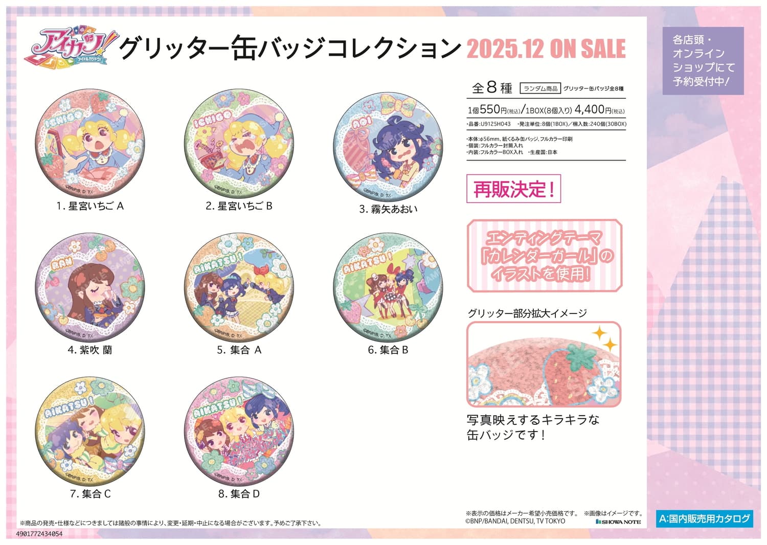 今回再販される「アイカツ!」の「グリッター缶バッジコレクション -カレンダーガール-」は、1個あたり550円(税込)。BOXは8個入りで価格は4,400円(税込)。