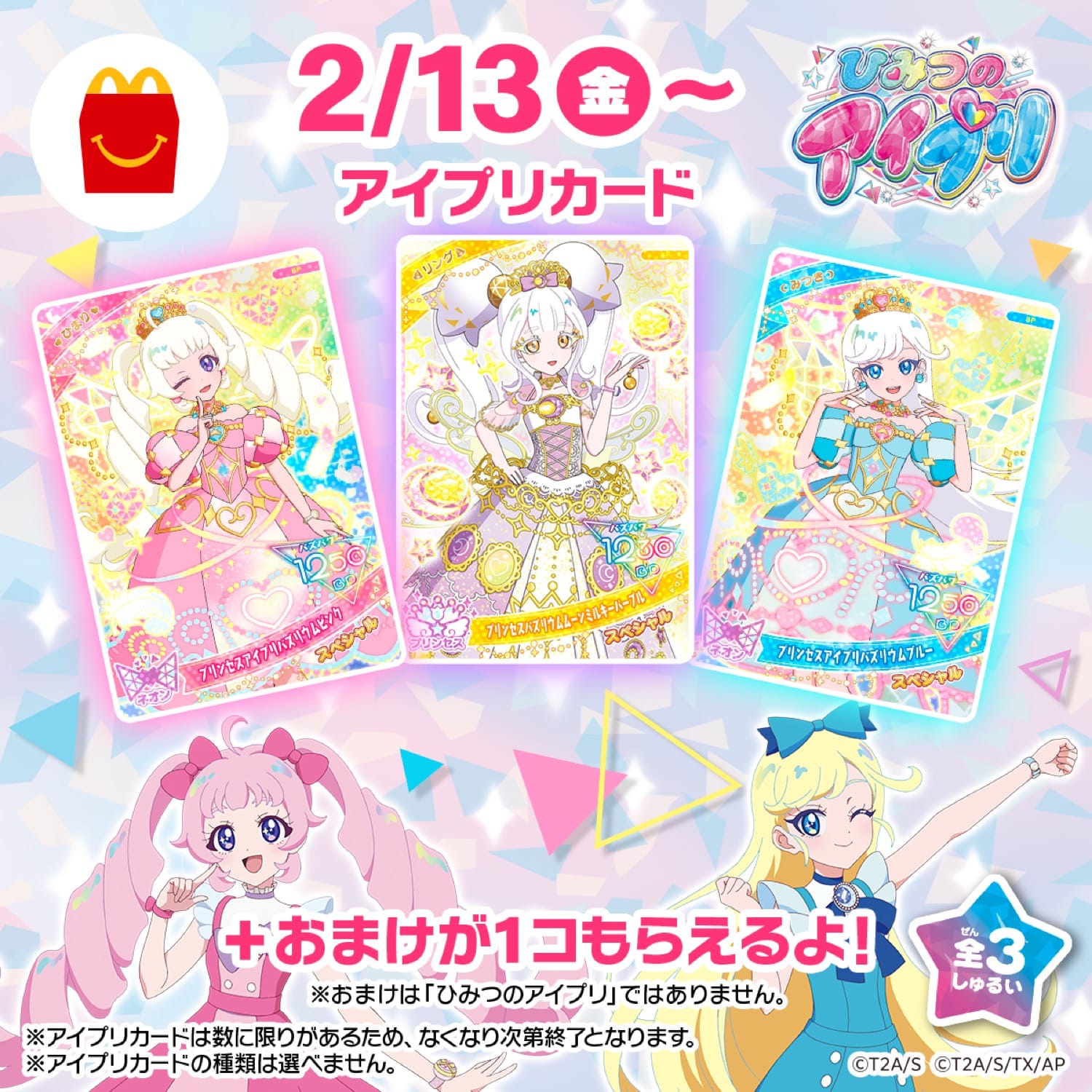 2026年2月13日より、全国のマクドナルドにて「ひみつのアイプリ」のアイプリカード1枚とおまけ1個がセットになった「ハッピーセット」が発売!