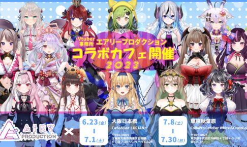 バーチャルYouTuber事務所「エアリープロダクション」のコラボカフェが、2023年6月23日よりcafé&bar LUCIAN+大阪にて、2023年7月8日よりWhite&CrossLoad秋葉原にて順次開催される。