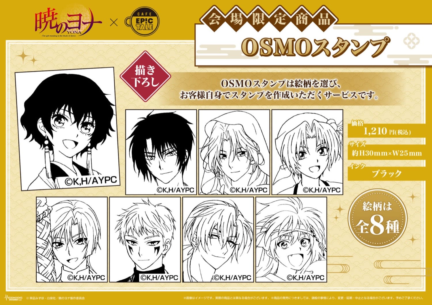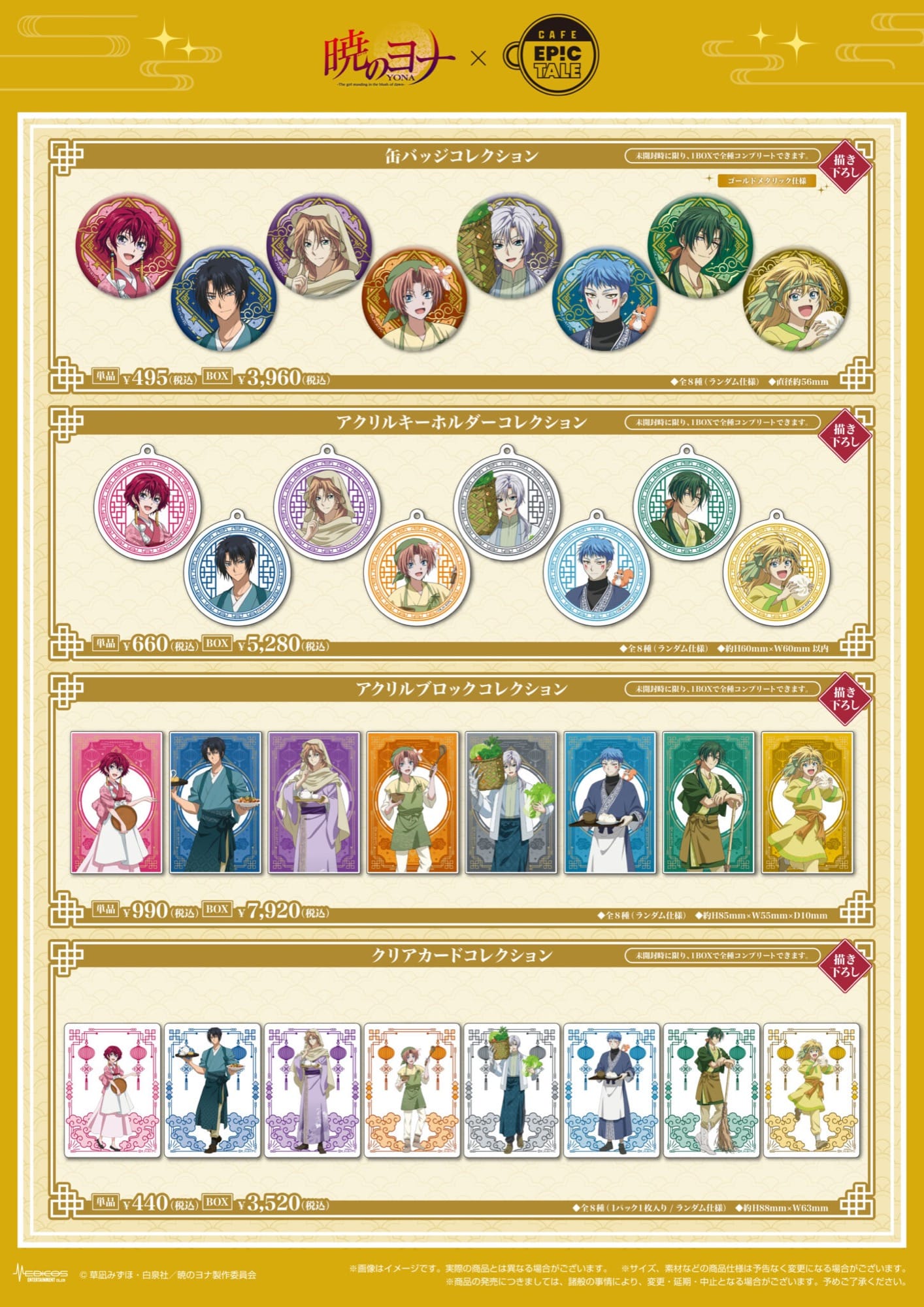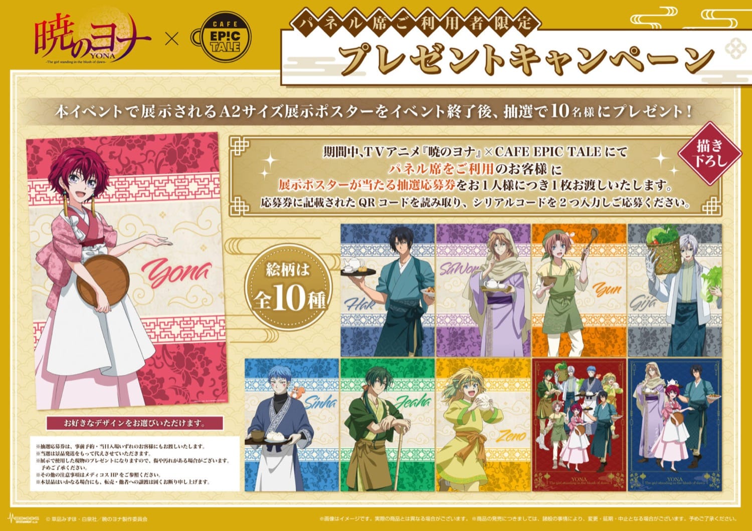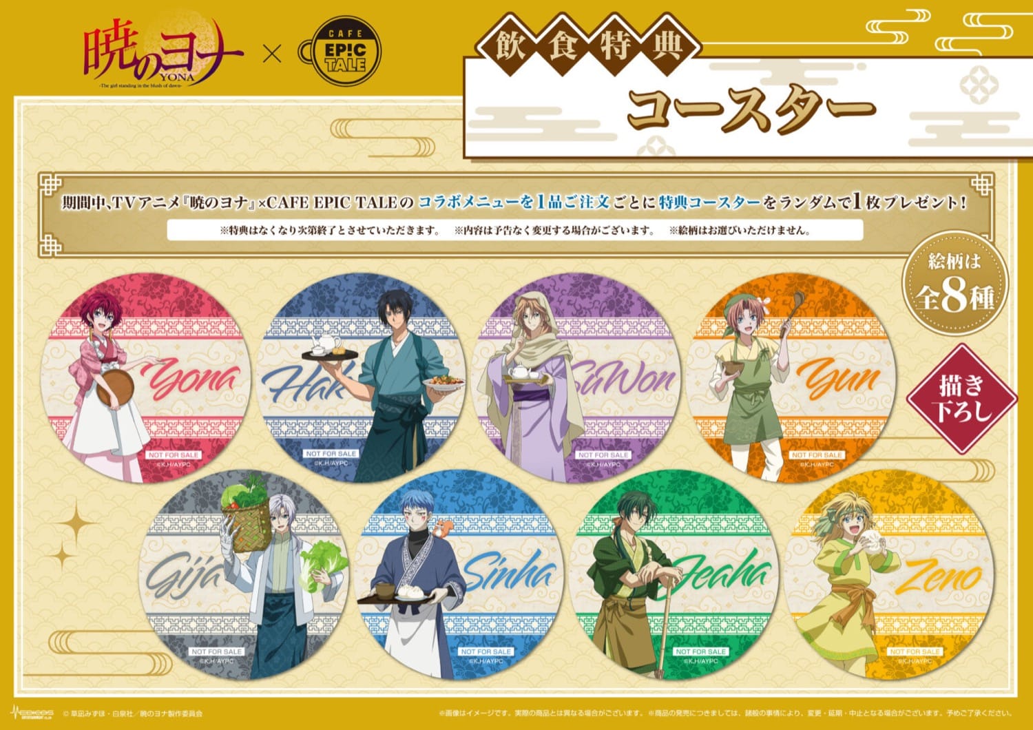 「暁のヨナ × CAFE EPIC TALE大阪」コラボにて、コラボメニューを1品注文ごとに特典として、描き下ろしイラストを使用した「特典コースター 全8種」がランダムに1枚プレゼントされる。