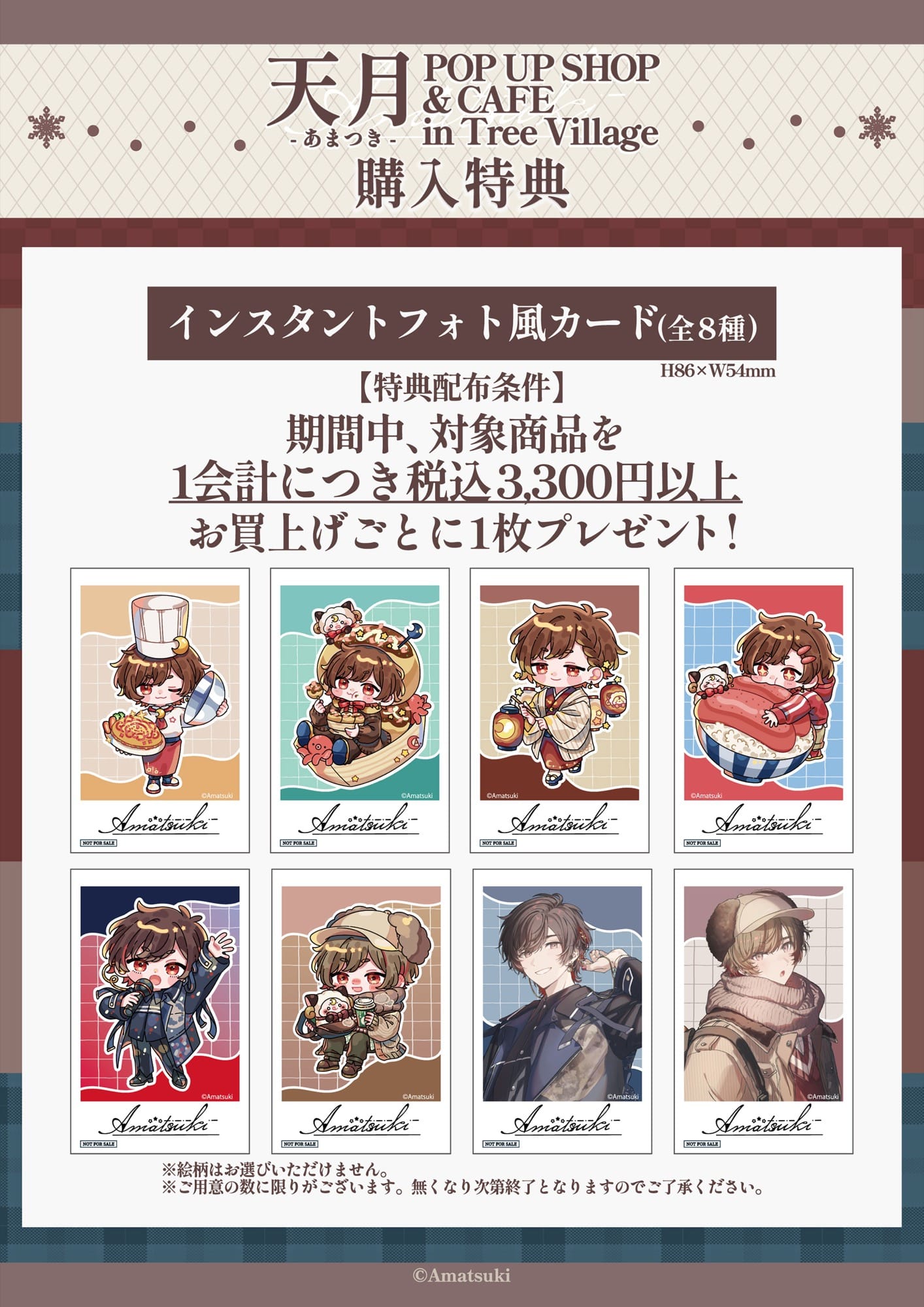 「天月 × ツリービレッジ3店舗」コラボにて、対象商品を3,300円(税込)以上購入ごとに、描き下ろしイラストを使用した「インスタントフォト風カード 全8種」がランダムに1枚プレゼントされる。