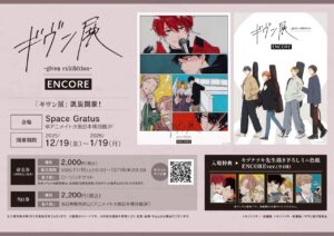 キヅナツキ先生原作のアニメ「ギヴン」の原画展「ギヴン展 -given exhibition-」が、アニメイト大阪日本橋別館 Space Gratusにて2025年12月19日〜2026年1月19日までアンコール開催される。入場特典として、キヅナツキ先生が新たに描き下ろしたイラスト入りミニ色紙が登場!