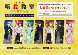 松井優征先生による人気漫画を原作としたアニメの最新映画『劇場版「暗殺教室」みんなの時間』公開を記念したアニメイトフェアが、2026年3月20日〜4月19日まで開催される。潮田渚らが和服を身に着け和傘を差している描き下ろしイラスト使用の新作グッズが多数ラインナップ!