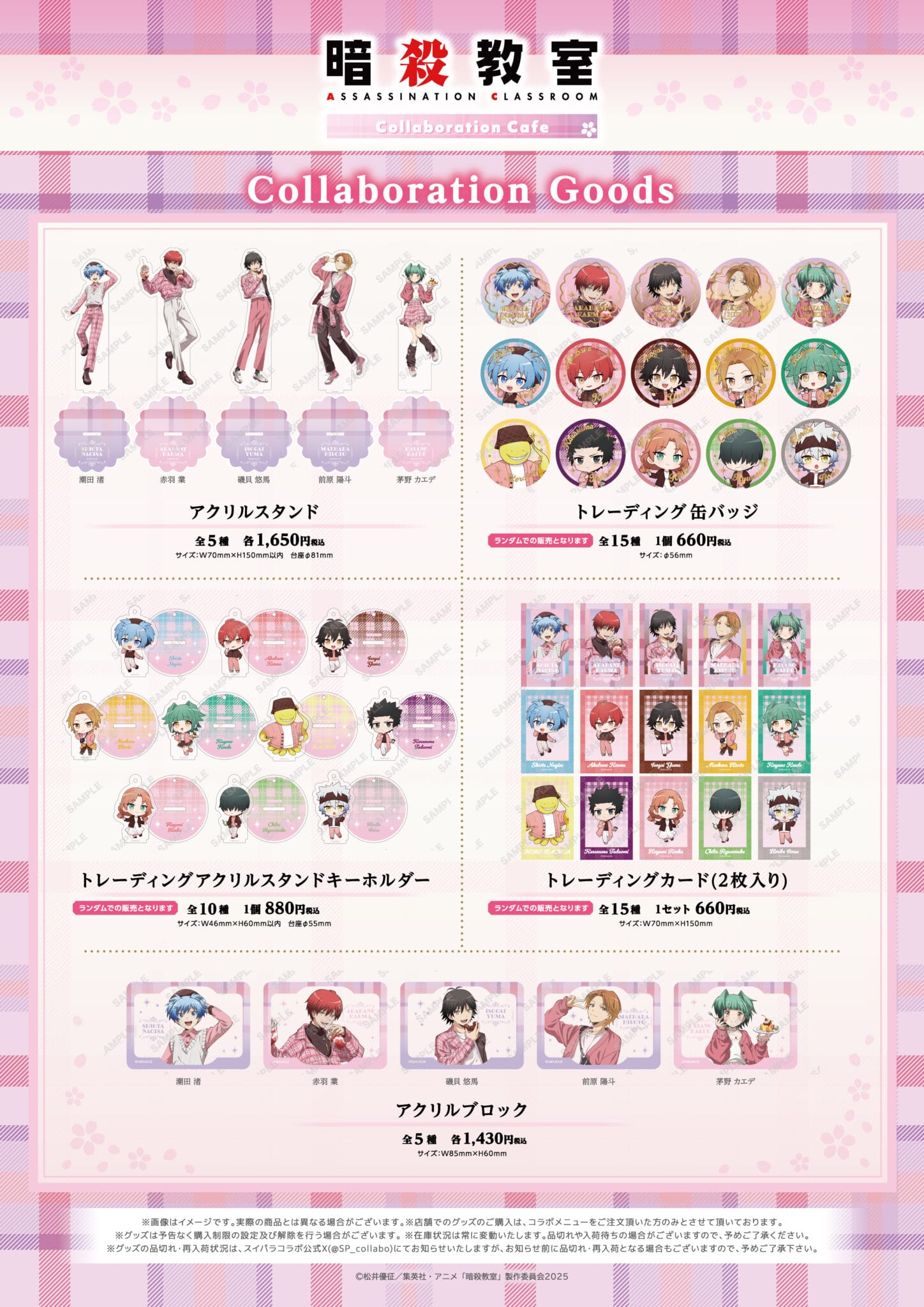 2026年3月17日より順次開催される「暗殺教室」カフェでは、春コーデの描き下ろしイラストを使用した「アクリルスタンド」「トレーディング缶バッジ」「アクリルブロック」などのコラボカフェ限定グッズが多数登場!