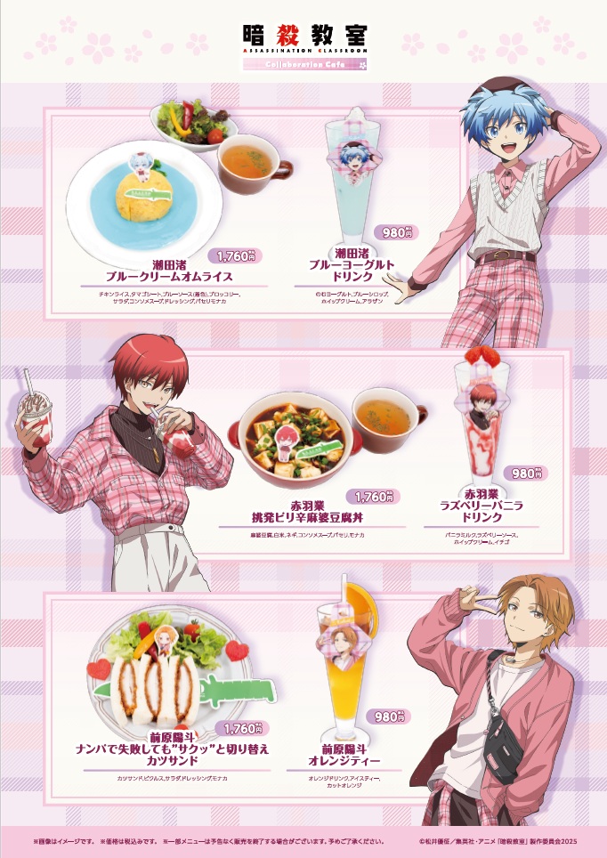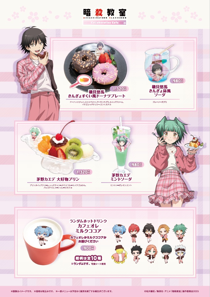 「暗殺教室」コラボカフェでは、春らしいピンクコーデのキャラクターたちをイメージしたコラボメニューがお楽しみいただける他、メニューを注文の方には「暗殺教室」カフェ限定の各種ノベルティーがプレゼントされる。