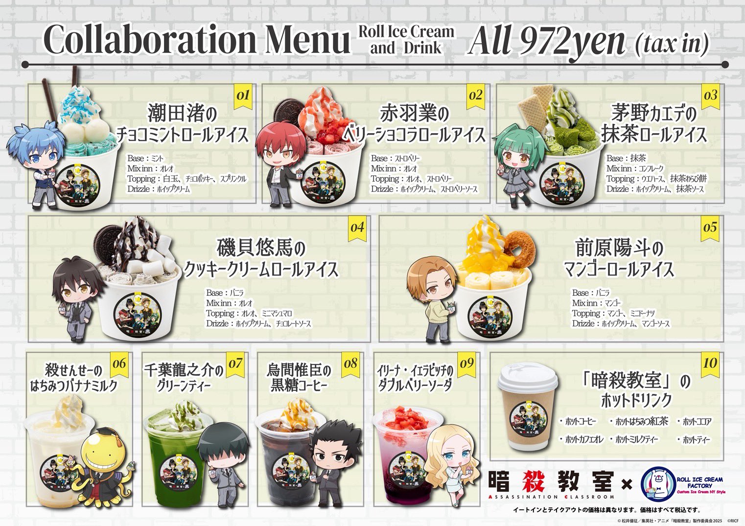 松井優征先生による人気漫画を原作としたアニメ「暗殺教室」の放送開始10周年を記念し、ロールアイスクリームファクトリー5店舗 (池袋/渋谷/原宿/天王寺/札幌) にて、2025年12月6日〜12月26日までコラボが開催される。
