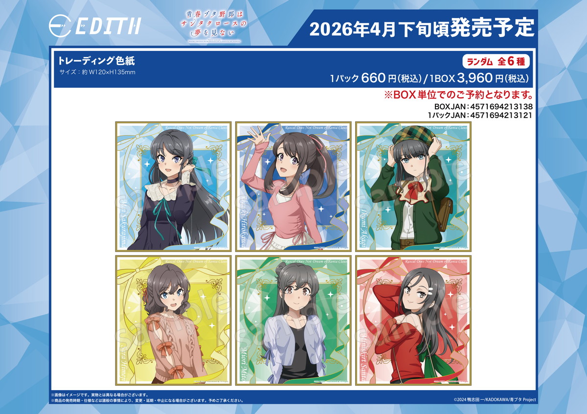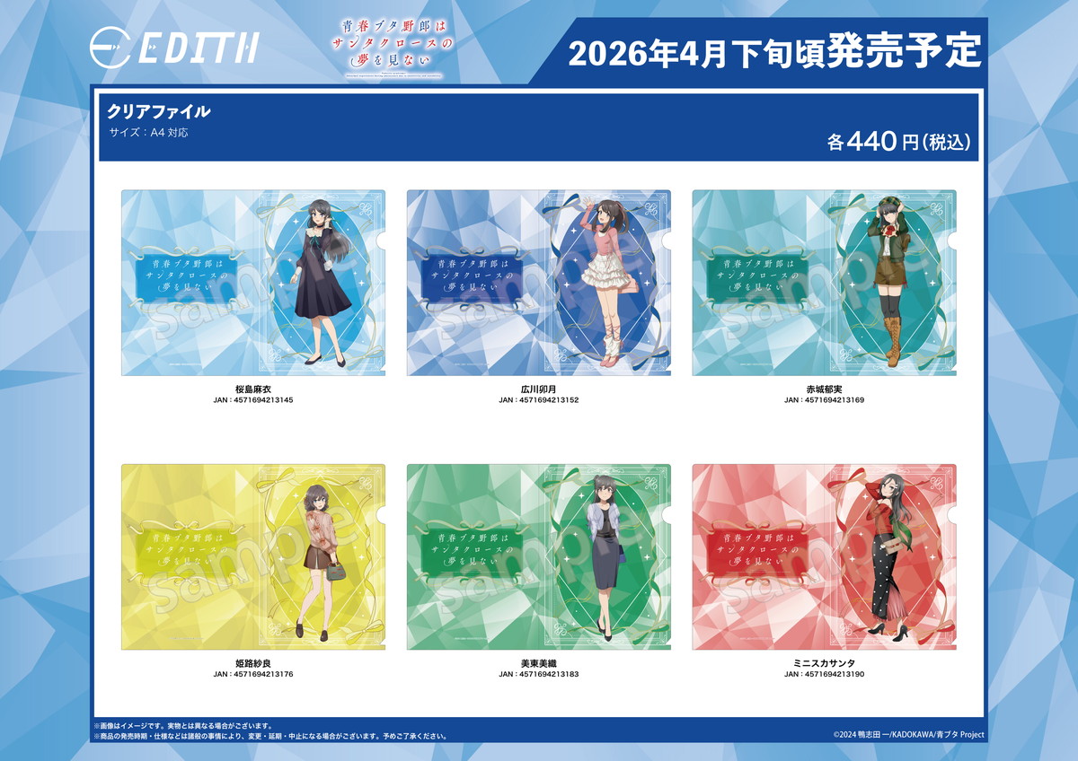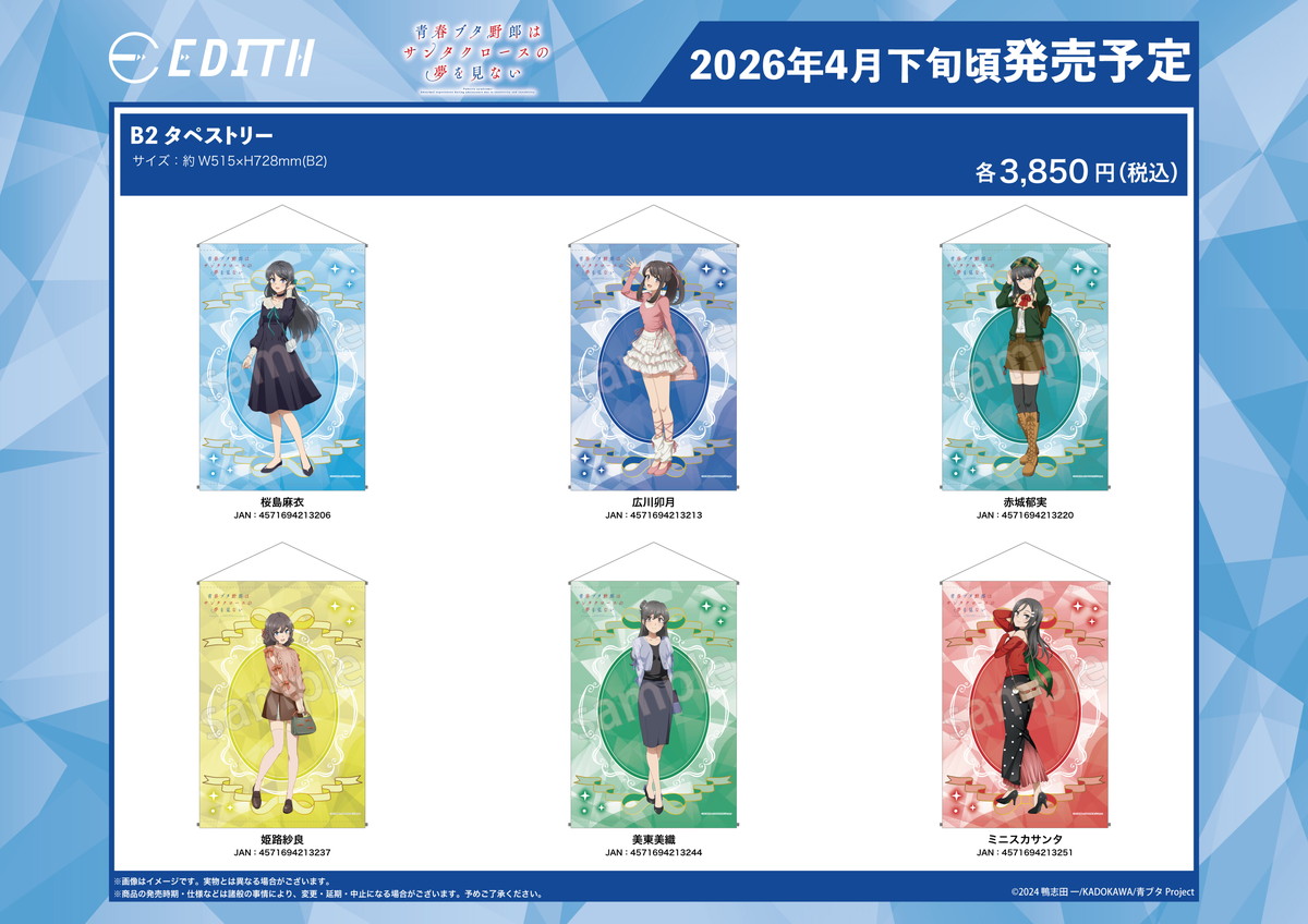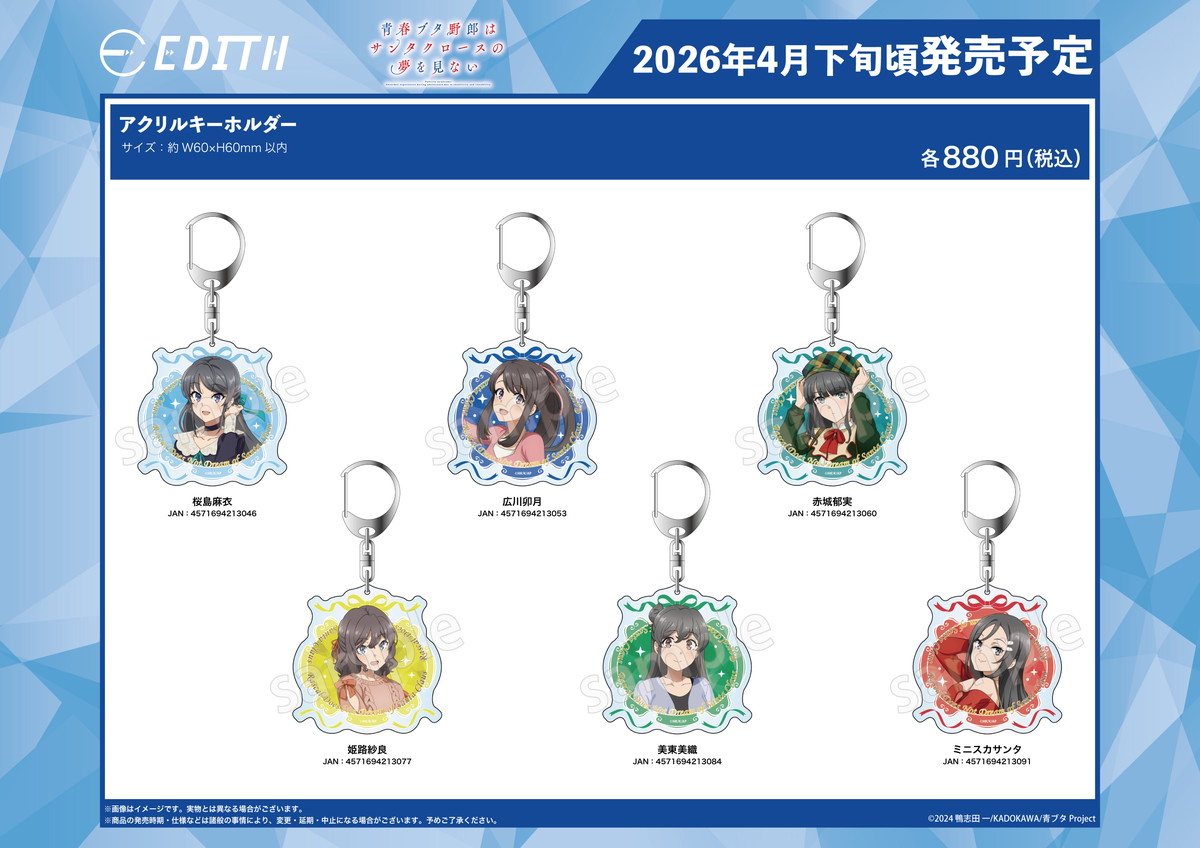 鴨志田一先生のライトノベルを原作とするTVアニメ『青春ブタ野郎はサンタクロースの夢を見ない (青ブタ)』から、イーディスによる新作アイテムが2026年4月に一般発売される。