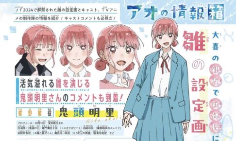 主人公「猪股大喜」の親友であり、新体操部のエースで恋も部活も真剣にまっすぐ向き合う明るく活発な「蝶野雛」役を演じるのは、「鬼頭明里」さんに決定!