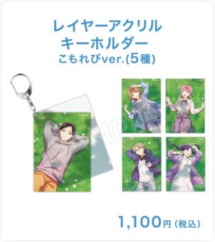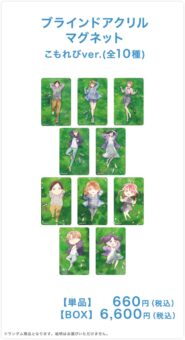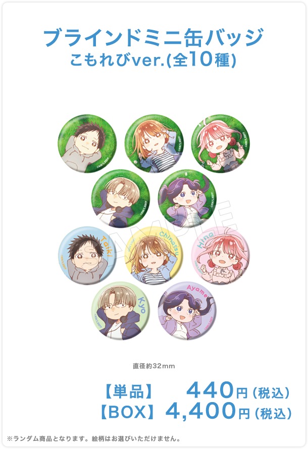 野原に気持ちようさそうに寝転ぶ猪股大喜・鹿野千夏らを描いた「缶バッジ」や「アクリルマグネット」「レイヤーアクリルキーホルダー」などがラインナップする。