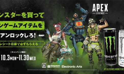 世界中で大人気を誇るバトルロイヤルシューティングゲーム「Apex Legends (エーペックスレジェンズ)」× モンスターエナジー (Monster Energyhttps)による、コラボキャンペーン「モンスターを買ってエーペックスレジェンズのインゲームアイテムをアンロックしろ! 」が2022年10月3日〜11月30日までの期間限定で開催される。