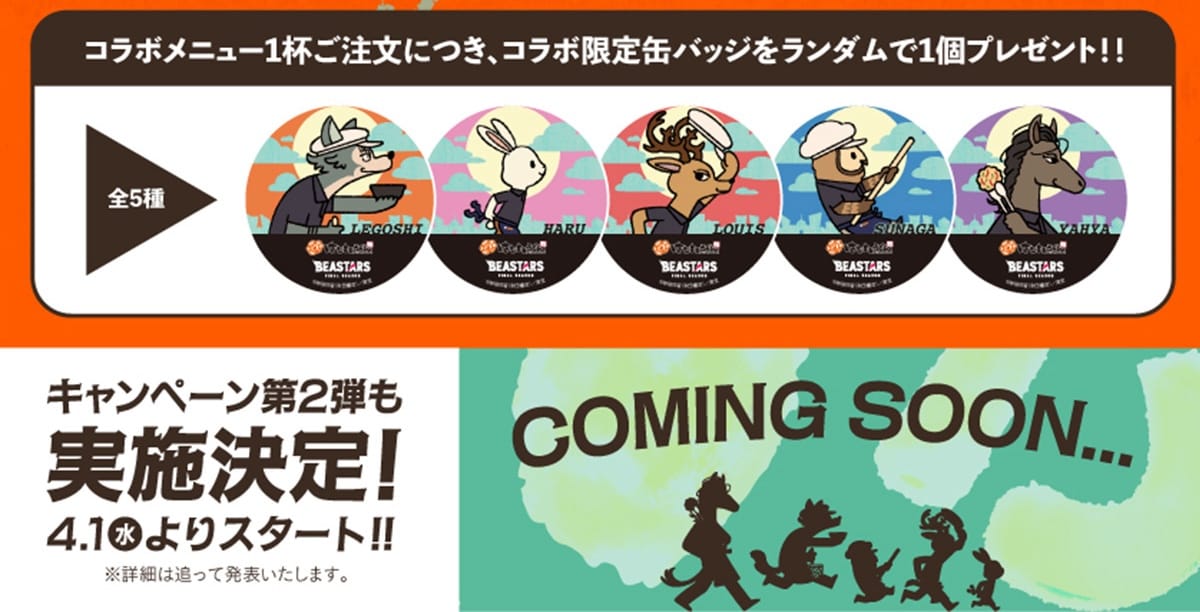 「BEASTARS × はなまるうどん」コラボにて、コラボメニューを1品注文するごとに、特典として「缶バッジ (全5種)」をランダムに1個プレゼント!