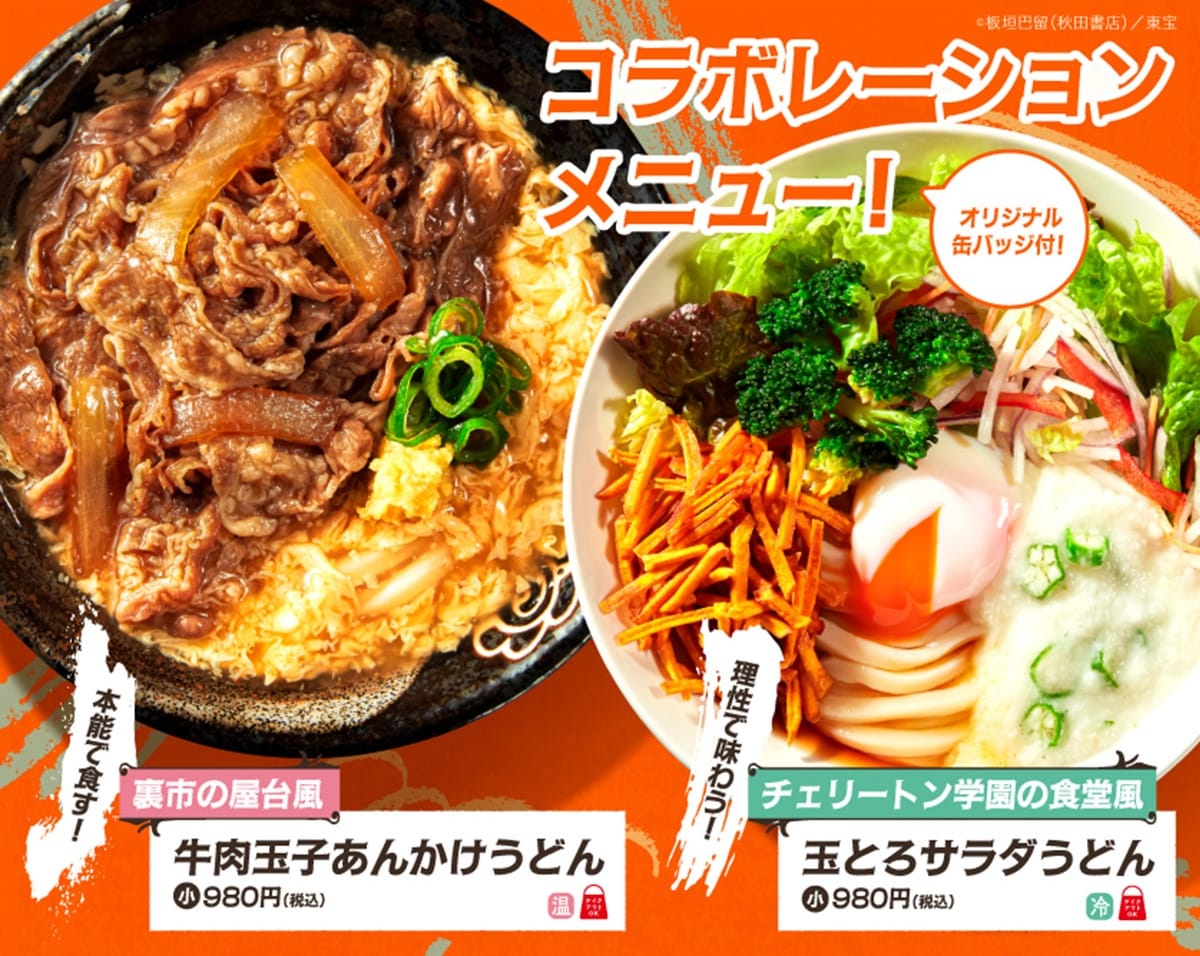 コラボメニューとして、「〔裏市の屋台風〕牛肉玉子あんかけうどん(温)」「〔チェリートン学園の食堂風〕玉とろサラダうどん(冷)」が登場する。