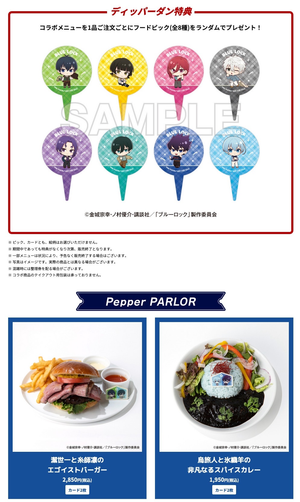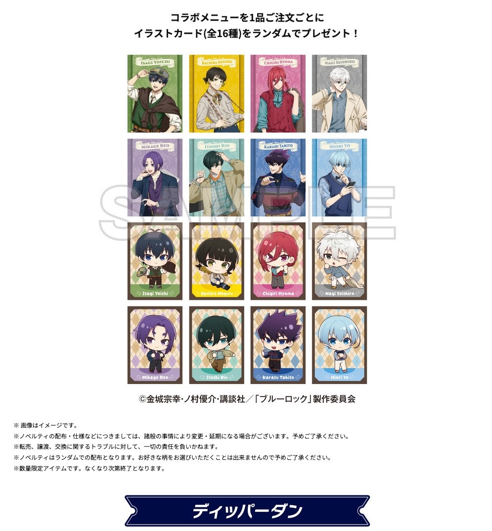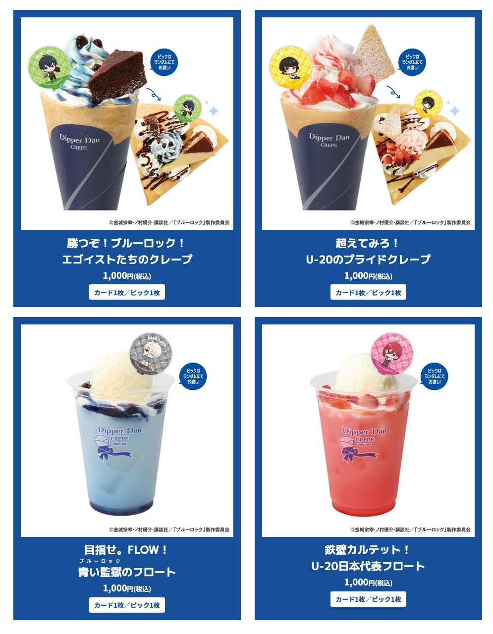 ディッパーダンには「勝つぞ!ブルーロック!エゴイストたちのクレープ」や「超えてみろ!U-20のプライドクレープ」「鉄壁カルテット!U-20日本代表フロート」などのコラボクレープやドリンクが、Pepper PARLORでは、「潔世一と糸師凛のエゴイストバーガー」や「凪誠⼠郎と御影玲王の絆パフェ」「蜂楽廻と千切豹⾺のツインパンケーキ」などのフードメニューとキャラクターをイメージした「キャラクタードリンク(全8種)」が登場!