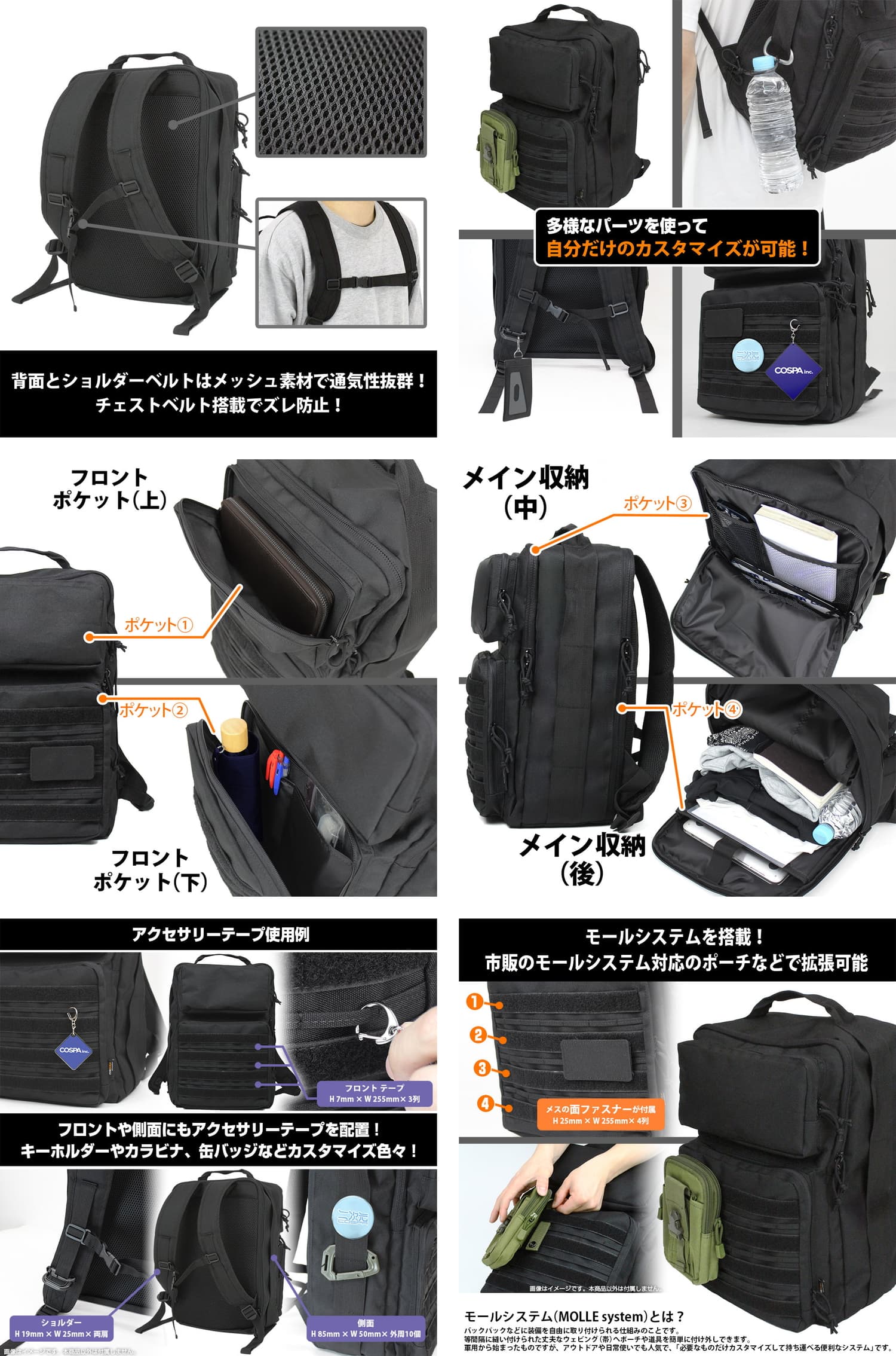 外側には、面ファスナー付きのモールシステムとアクセサリーテープを搭載。