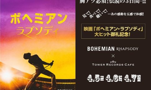 4月17日の「クイーンの日」に向けたスペシャル企画!見て!食べて!聴いて!あの感動を五感で体感!イギリスの伝説的ロックバンド「Queen (クイーン)」のボーカリスト「フレディ・マーキュリー」を主人公とした大ヒット伝記映画「ボヘミアン・ラプソディ」× タワーレコードカフェ表参道にて2019年4月5日より3日間限定で映画大ヒット御礼記念「ボヘミアン・ラプソディカフェ」コラボ開催!スペシャル上映会、衣装展示、コラボメニュー、タワレコ限定グッズなど盛り沢山!