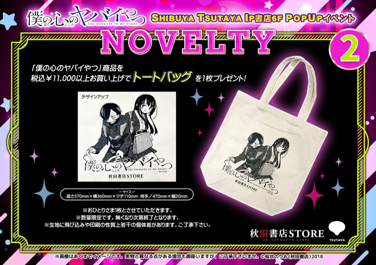 「僕の心のヤバイやつ」ポップアップストアにて、対象商品の2,200円(税込)以上ご購入毎にノベルティポストカード(全5種)をランダムで1枚、さらに11,000円(税込)以上のご購入でトートバックを1枚プレゼント!